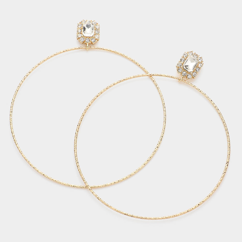 Rectangle Rhinestone Cluster Textured Metal Open Circle Dangle Earrings