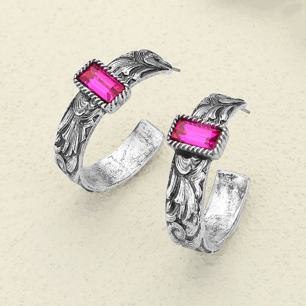 Rectangle Stone Pointed Antique Metal Western Hoop Earrings