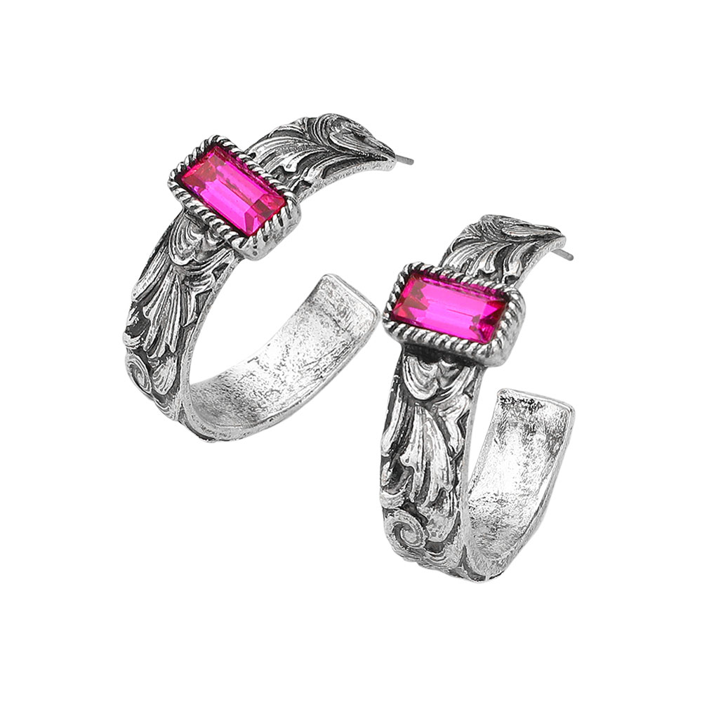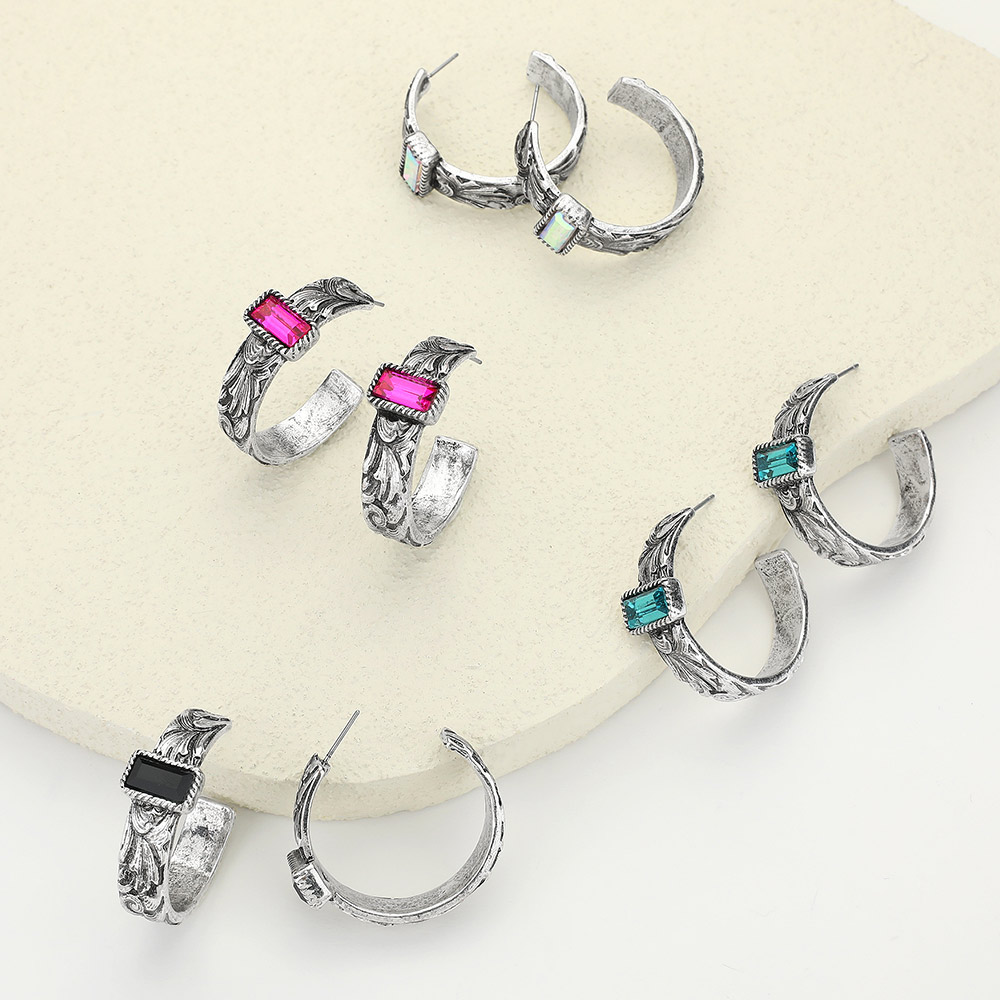 • Textured half hoop earrings featuring a bold square gem detail and vintage design. A statement piece with character and classic charm.