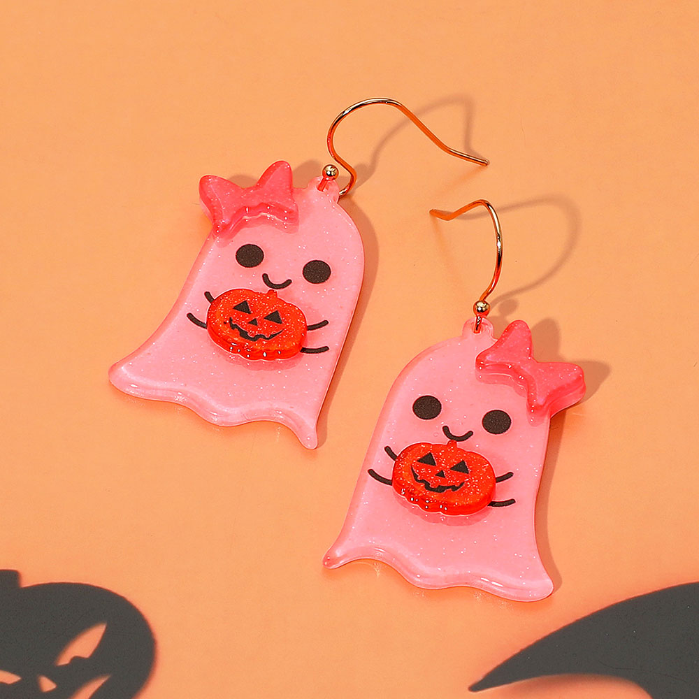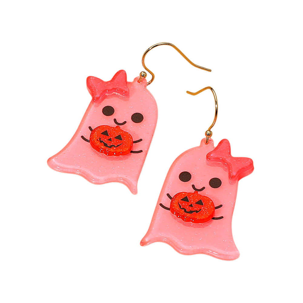 Details • Size : 1" X 2" • Fish Hook Back • Adorable Halloween earrings featuring smiling ghost charms with pumpkin accents and bow detail. A fun and festive accessory for spooky season outfits or costume parties. Lightweight and playful design. • Lead and Nickel Compliant