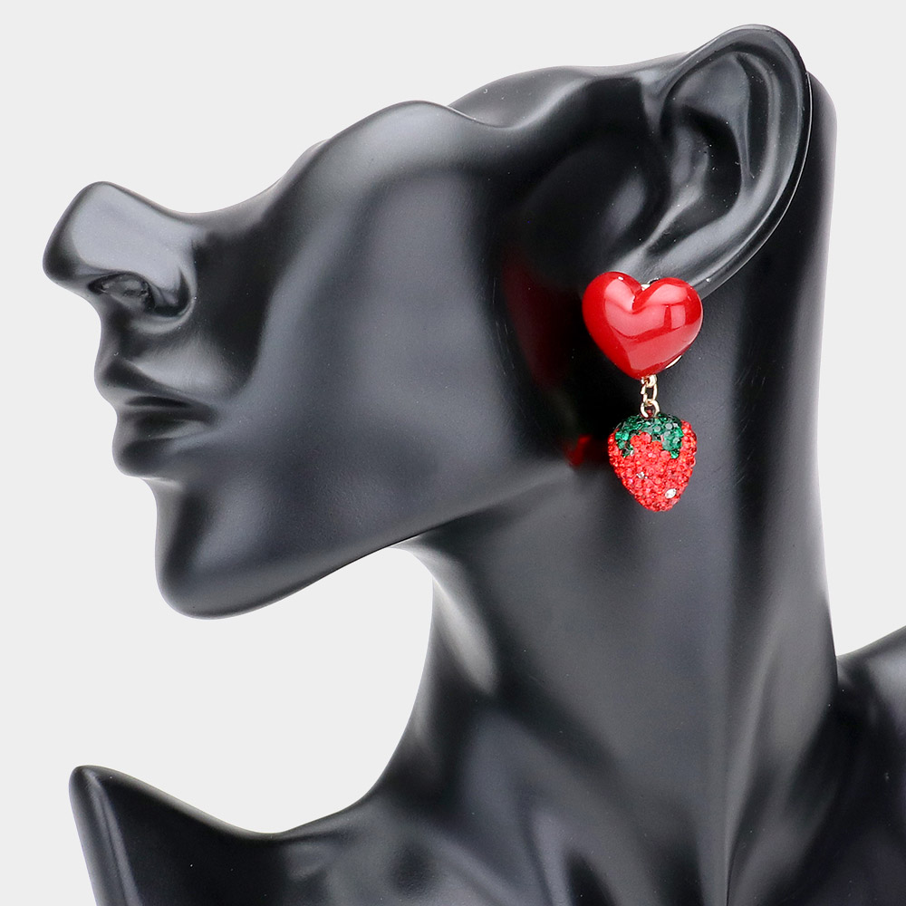 Resin Heart Rhinestone Embellished Strawberry Link Dangle Earrings