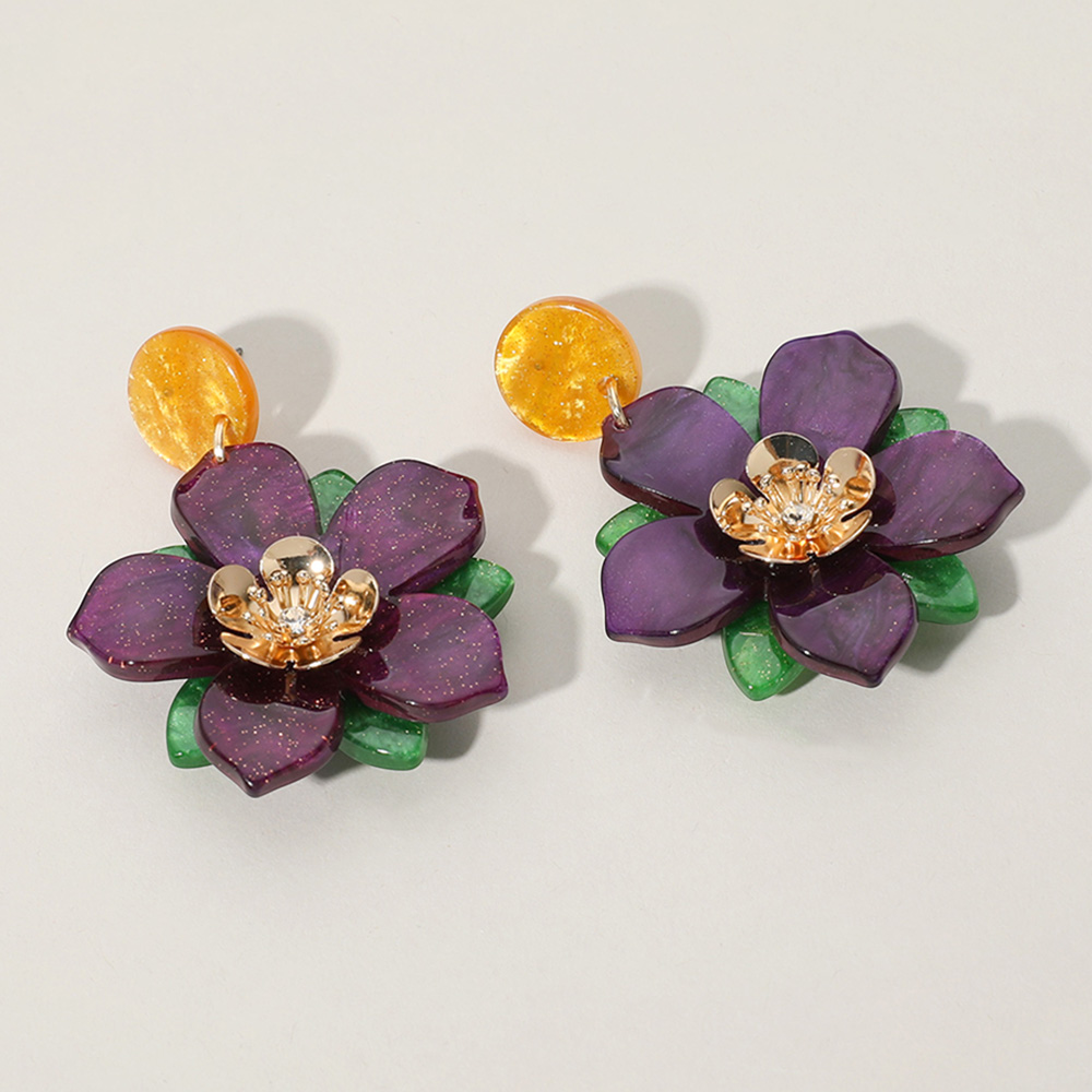Faux Leather Back Mirror Beaded Floral Dangle Earrings