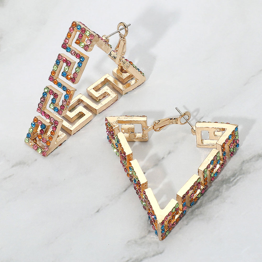 Rhinestone Embellished Greek Patterned Triangle Hoop Earrings