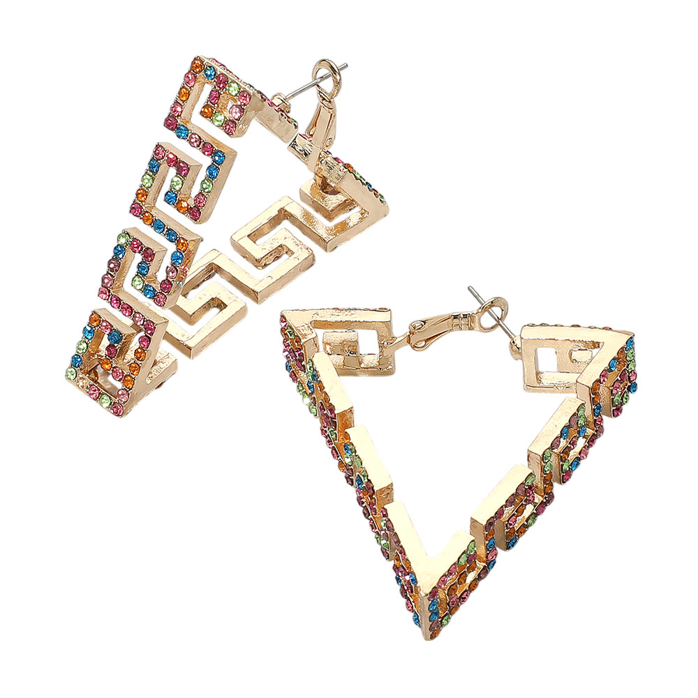 • Stand out with triangle hoop earrings featuring a bold geometric pattern and multicolor rhinestones. A unique blend of modern style and vibrant sparkle for any occasion.