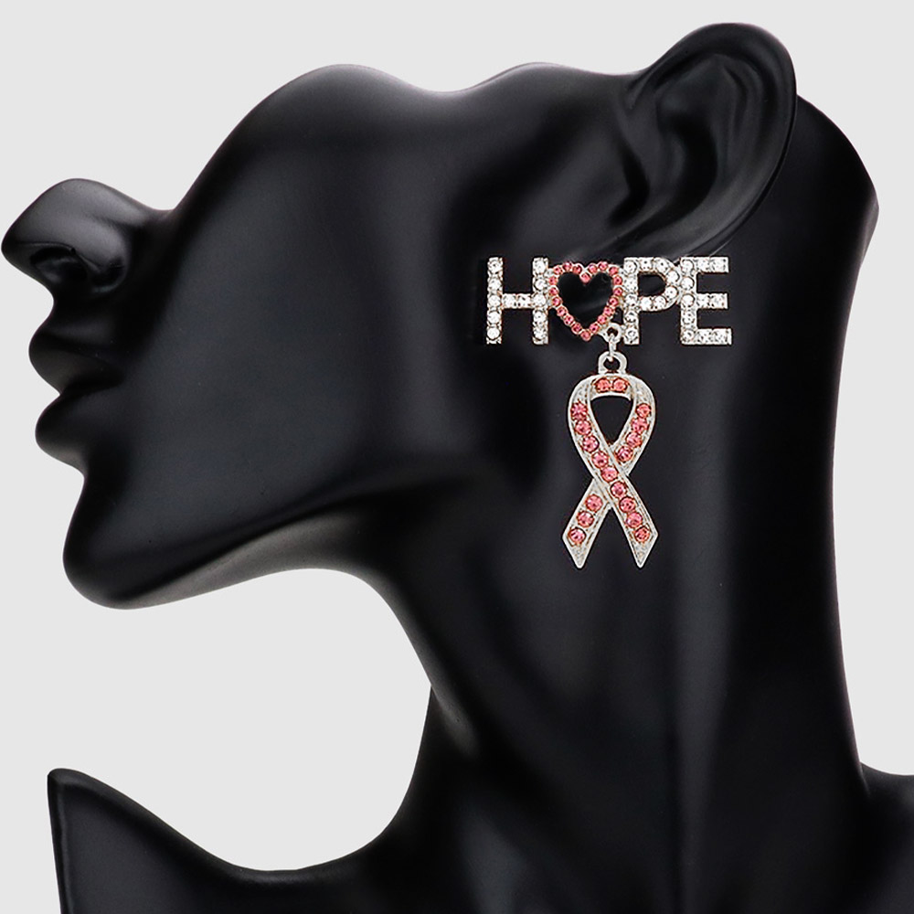 Rhinestone Embellished Hope Message Pink Ribbon Link Dangle Earrings