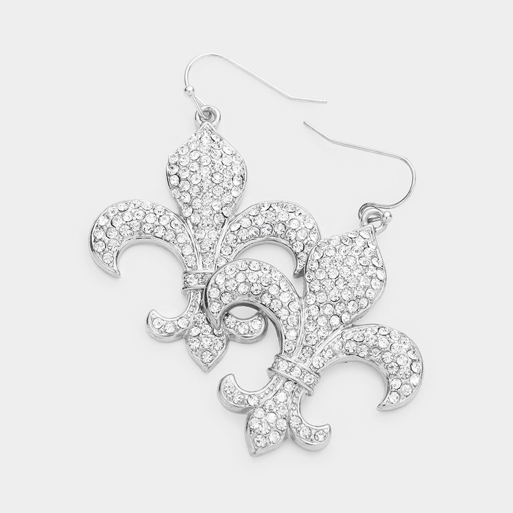 Rhinestone Embellished Metal Fleur de Lis Dangle Earrings