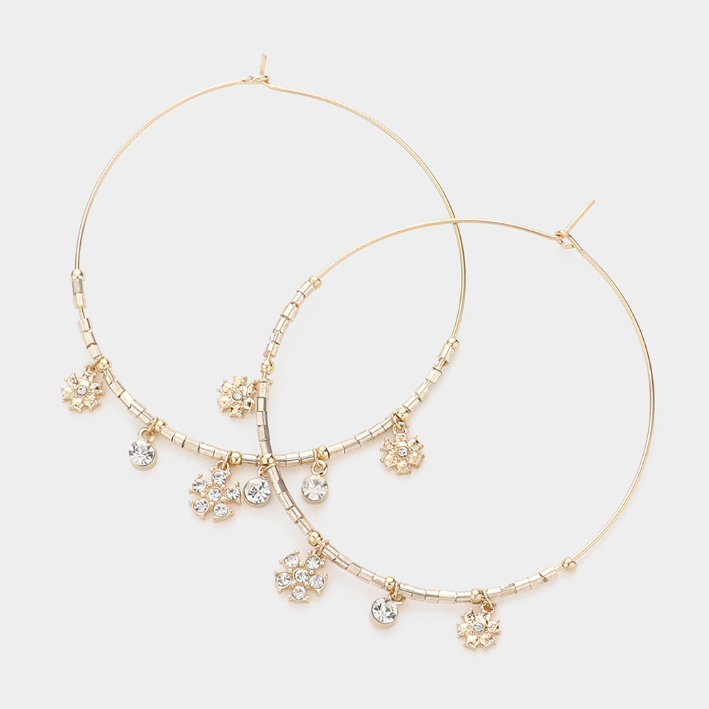 Rhinestone Embellished Metal Flower Beaded Open Circle Earrings
