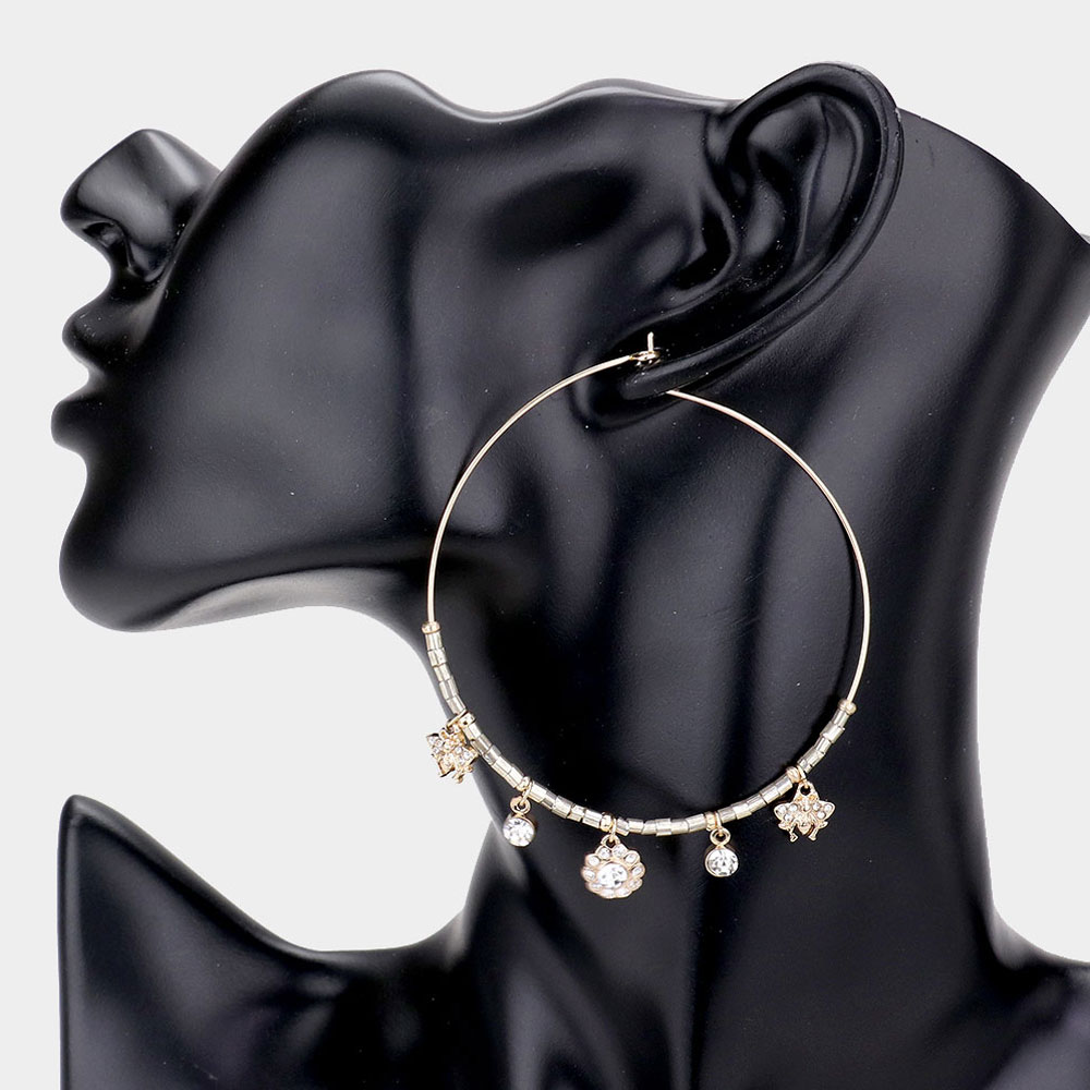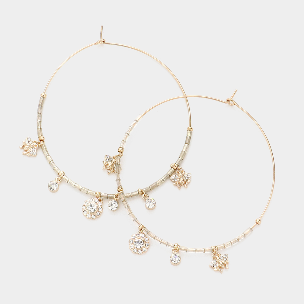 Rhinestone Embellished Metal Flower Honey Bee Beaded Open Circle Earrings