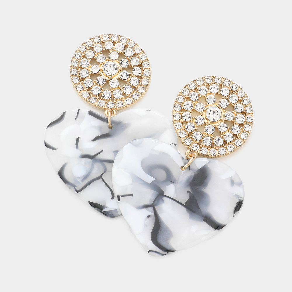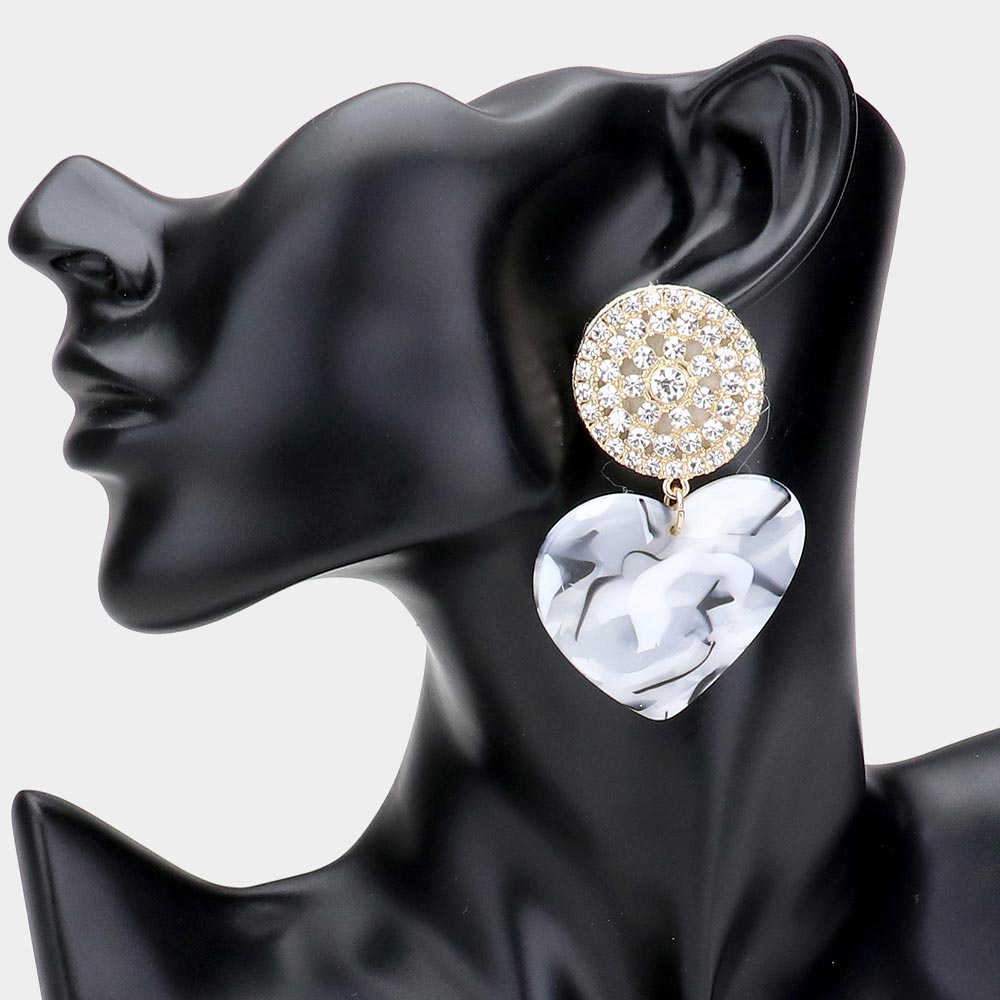 Rhinestone Embellished Round Celluloid Acetate Heart Link Dangle Earrings
