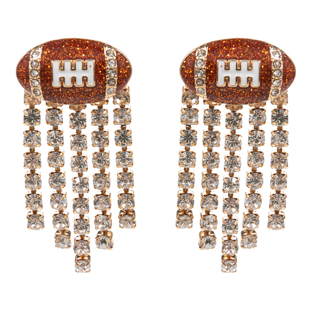 Details • Size : 0.75" X 1.5" • Titanium Post Back • These Football Fringe Rhinestone Dangle Earrings showcase a playful sports-inspired design adorned with cascading rhinestone strands. Perfect for game days, parties, or sporty fashion lovers, they combine sparkle and movement for a bold statement look that stands out effortlessly. • Hypoallergenic • Lead and Nickel Compliant