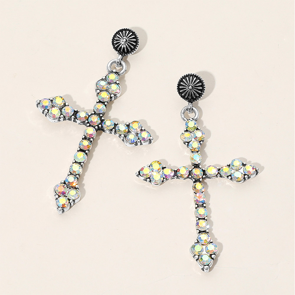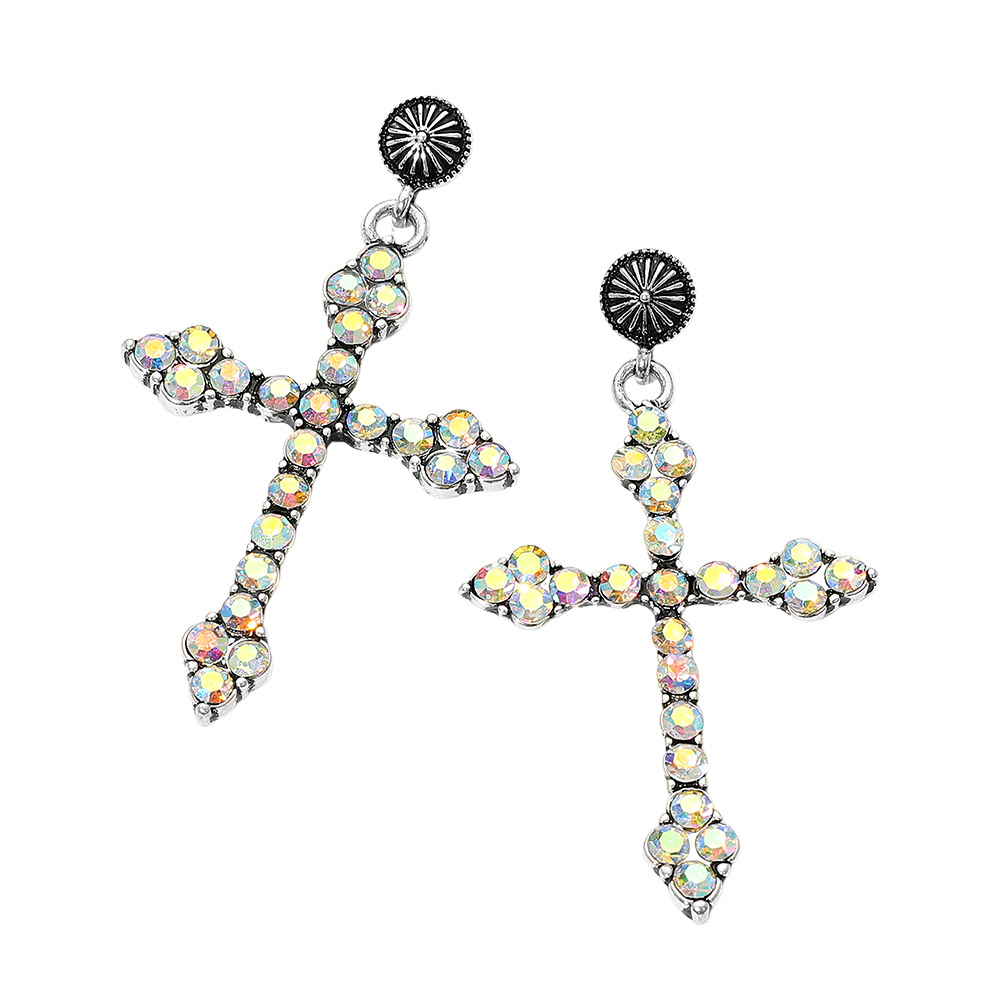 Details • Size : 1.75" X 2.75" • Post Back • Make a bold impression with these sparkling cross drop earrings. Embellished with shimmering rhinestones, they’re perfect for adding statement shine to party looks, evening outfits, or edgy styles. • Lead and Nickel Compliant
