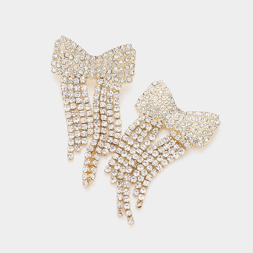 Details • Size : 1.1" X 2.1" • Post Back • Add timeless glamour with these rhinestone bow earrings featuring a cascading fringe design. Ideal for elegant events or festive nights out, they bring movement, brilliance, and charm to your accessory collection. • Lead and Nickel Compliant