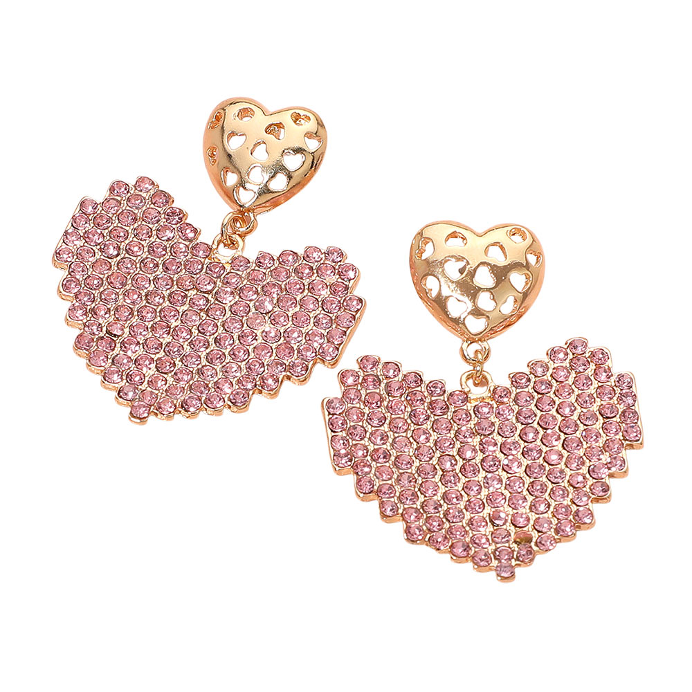 • Eye-catching heart drop earrings featuring a cutout upper heart and a radiant crystal pavĂ© lower heart in a bold layered silhouette. A perfect statement accessory for parties, gifting, or elevating everyday outfits with sparkle and charm.