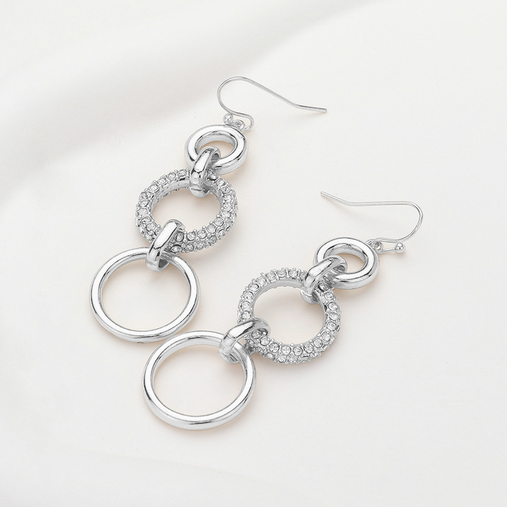 Metal Two Tone Stone Paved Triple Ring Link Drop Earrings
