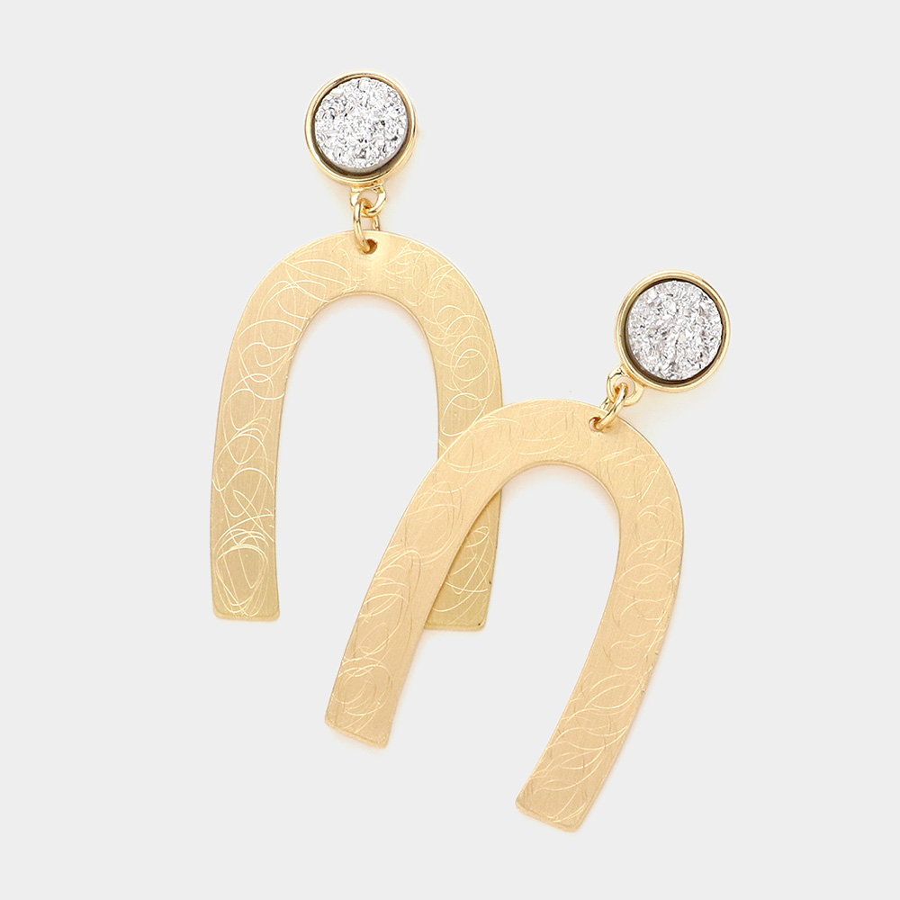 Round Druzy Scratched Metal Arch Link Dangle Earrings