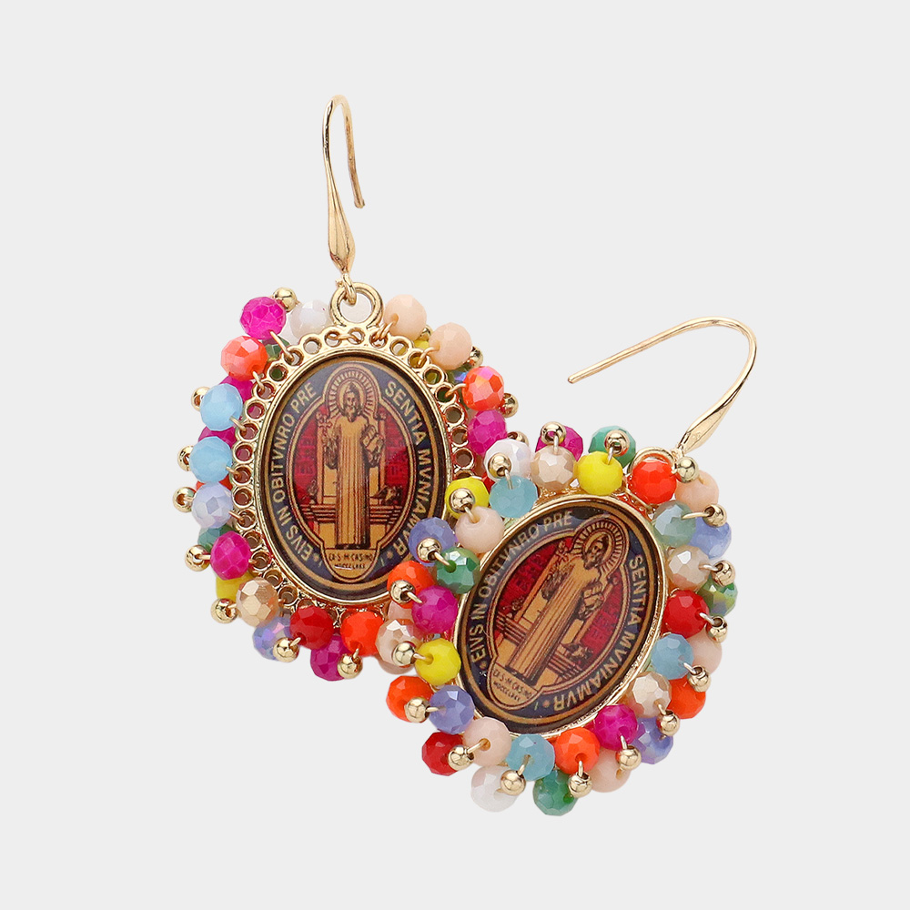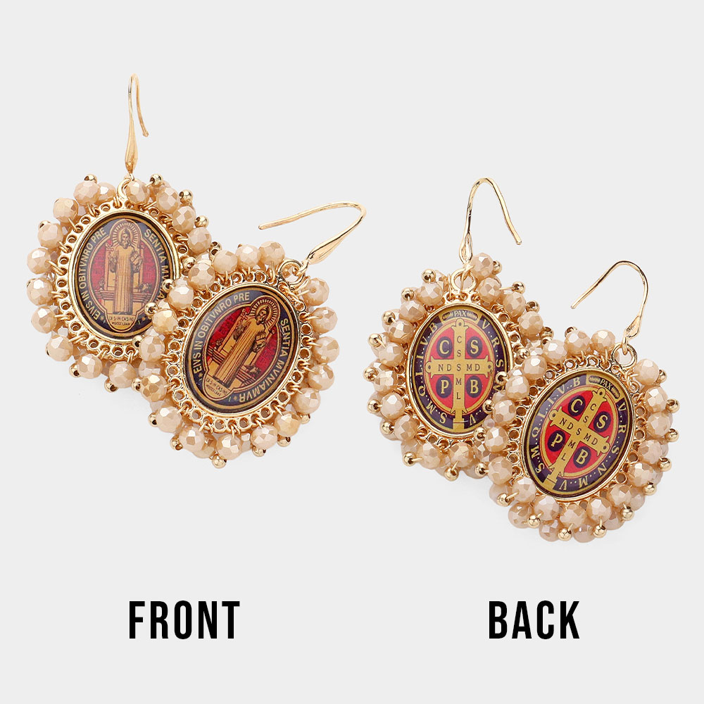 Saint Benedict Cross Printed Faceted Bead Cluster Dangle Earrings