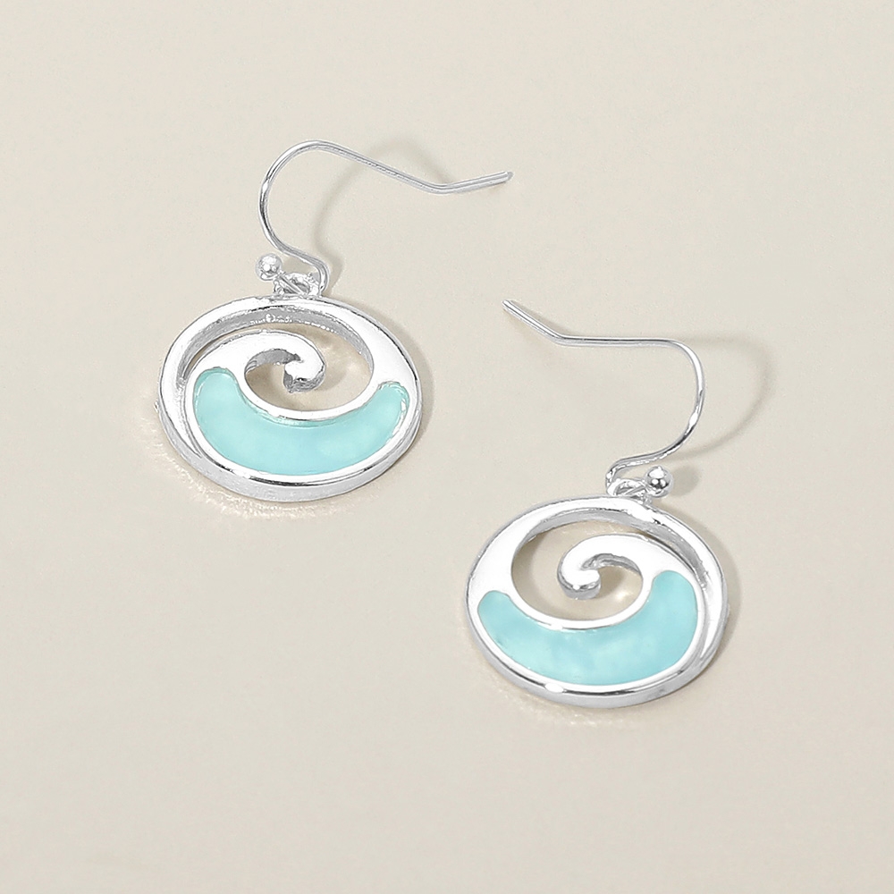Details • Size : 0.75" X 1.2" • Fish Hook Back • Stylish ocean-inspired dangle earrings featuring a graceful swirl wave design in a circular silhouette. Lightweight with fluid movement, these earrings bring a coastal, beach-ready feel to everyday outfits, vacation looks, resort wear collections, and giftable accessory assortments for boutiques. • Lead and Nickel Compliant