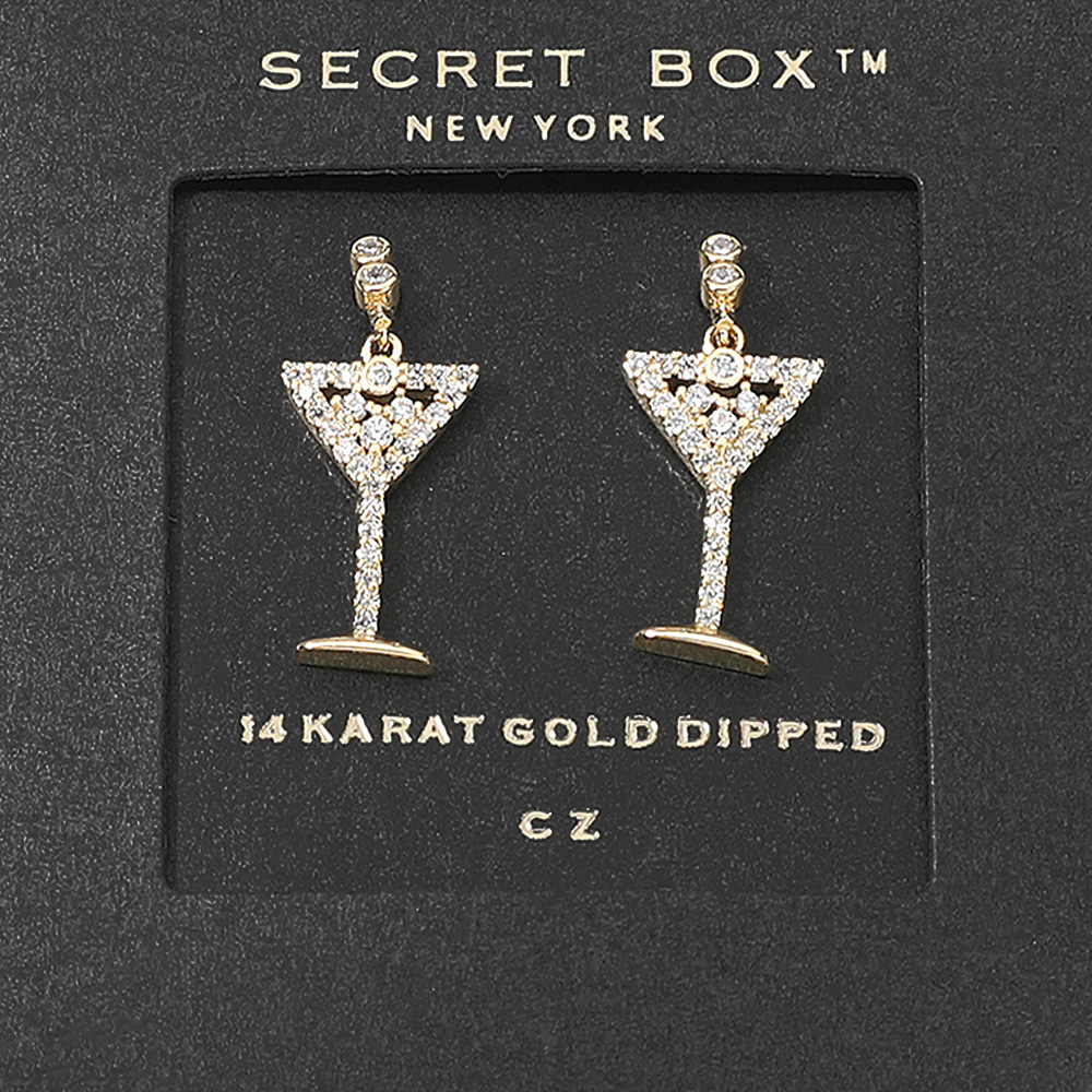 SECRET BOX_14K Gold Dipped CZ Stone Paved Cocktail Glass Dangle Earrings