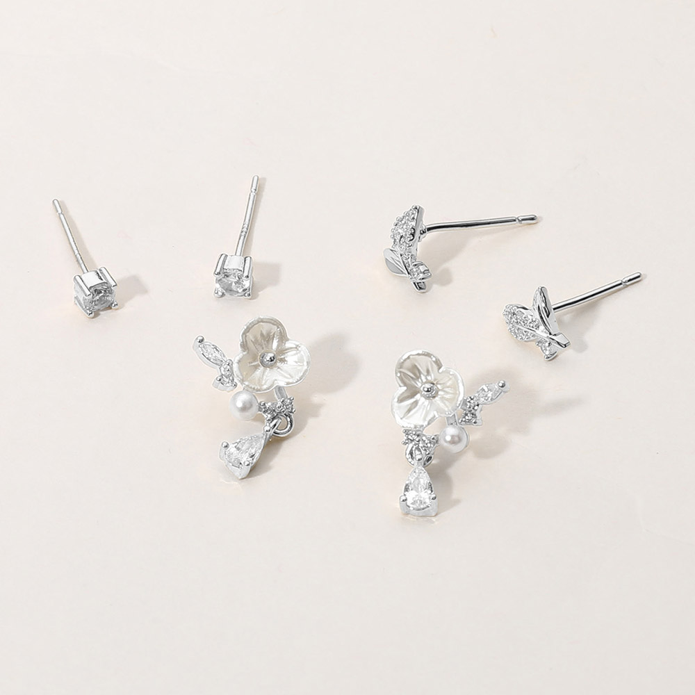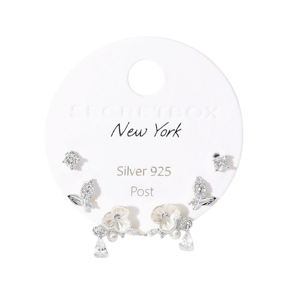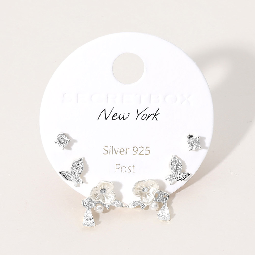 Details • Size : 0.1" L - 0.25" L - 0.6" L • Post Back • Elegant 3-pair earring set crafted from 925 sterling silver. Features floral motifs, sparkling studs, and delicate butterfly accents. Hypoallergenic and perfect for sensitive ears. Stylish for everyday wear or special occasions. • Sterling Silver Post