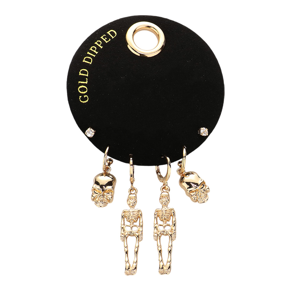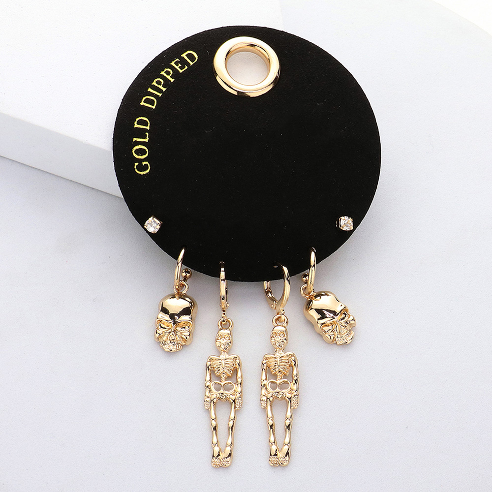 SECRET BOX_Gold Dipped Halloween Metal Skeleton Stone Stud 3 Pairs Earring Set