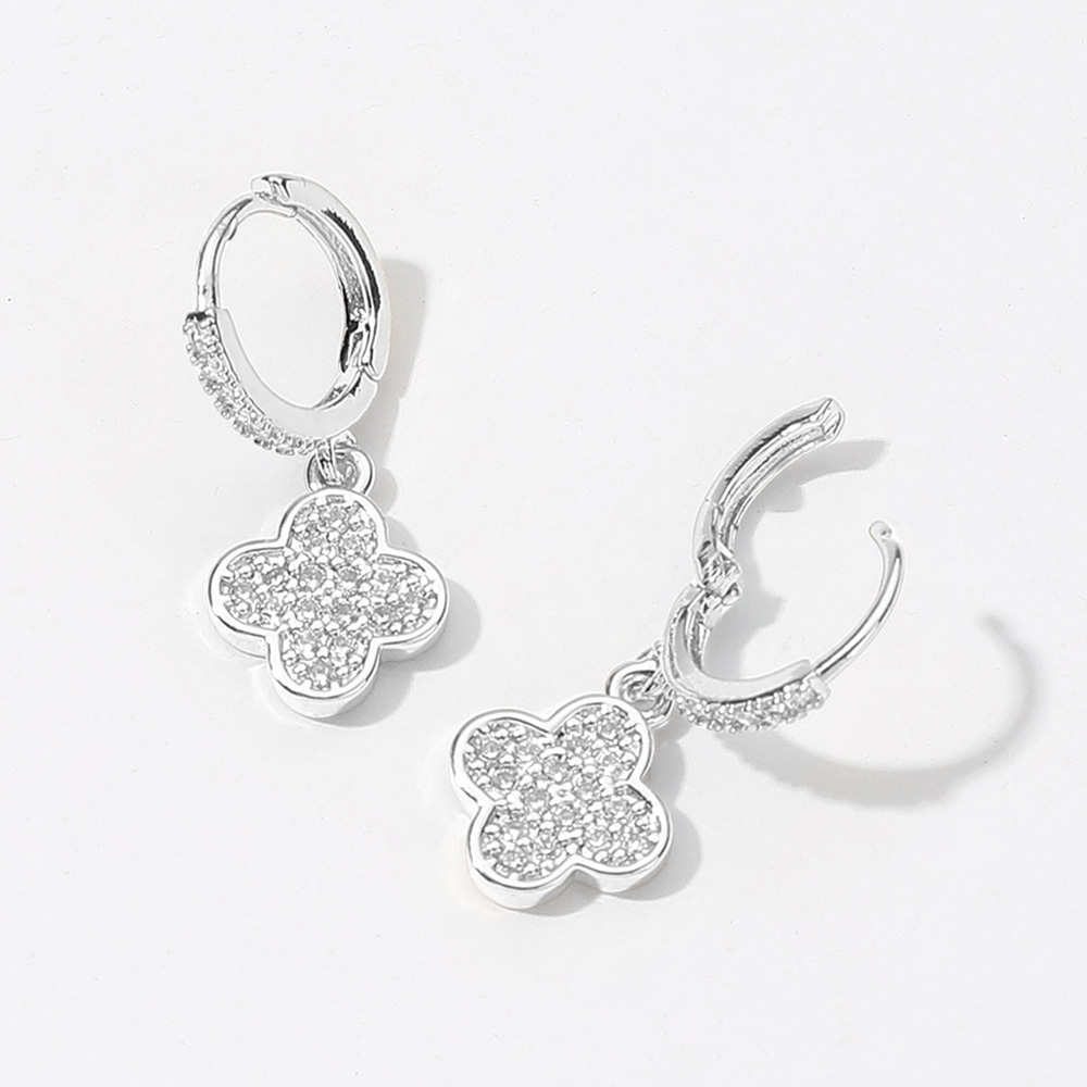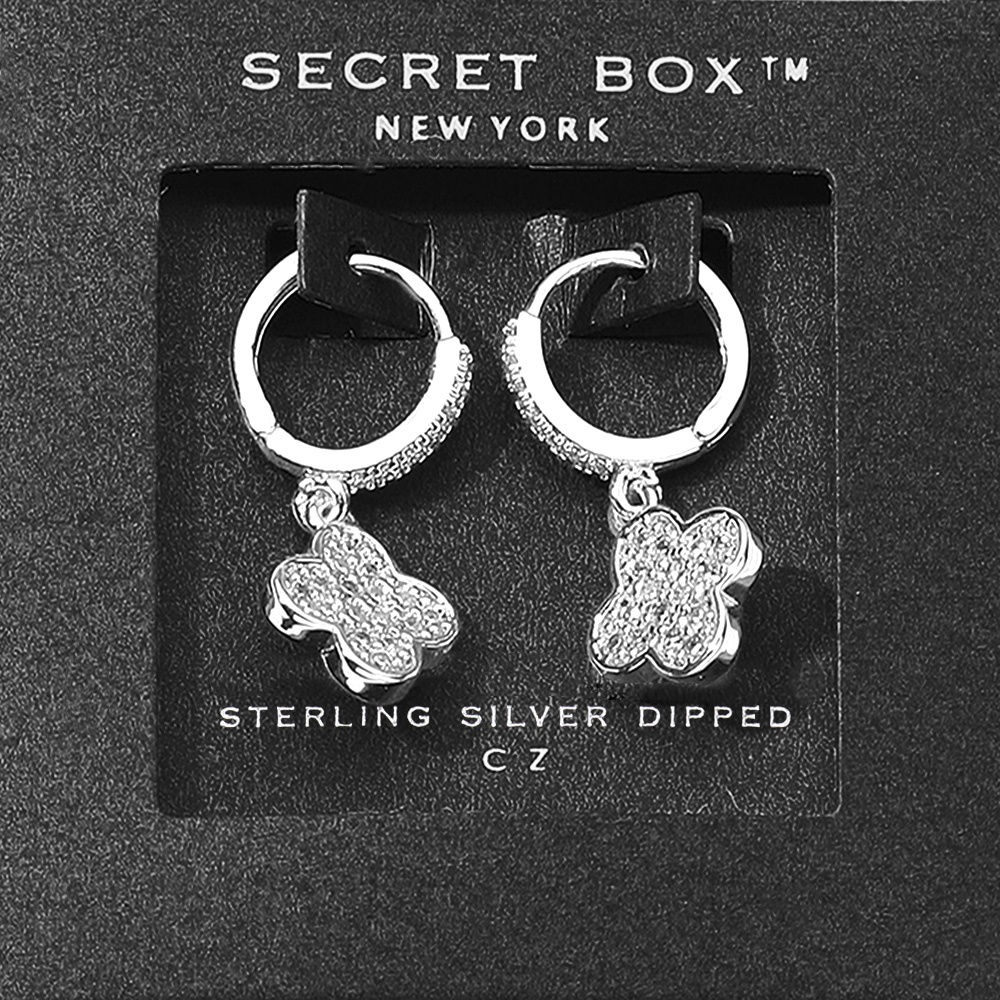 SECRET BOX_Sterling Silver Dipped CZ Stone Paved Quatrefoil Dangle Huggie Earrings