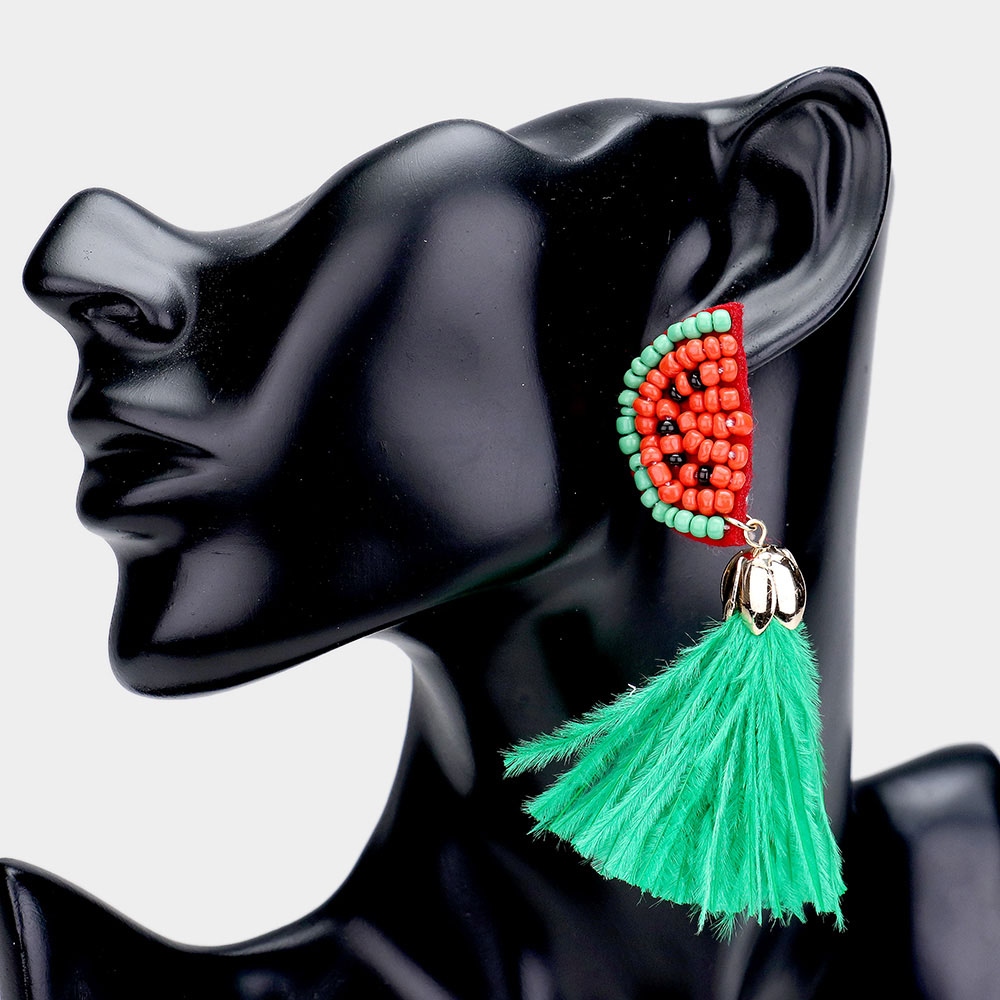 Seed Bead Watermelon Feather Tassel Dangle Earrings