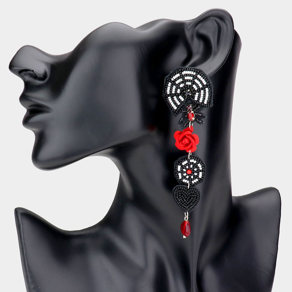 Details • Size : 1.25" X 4" • Post Back • Long dangle earrings featuring spiderweb patterns, a rose accent, and heart details. A bold statement piece for Halloween outfits or gothic-inspired looks. Lightweight with secure fit for all-day wear. • Lead and Nickel Compliant • Made In India