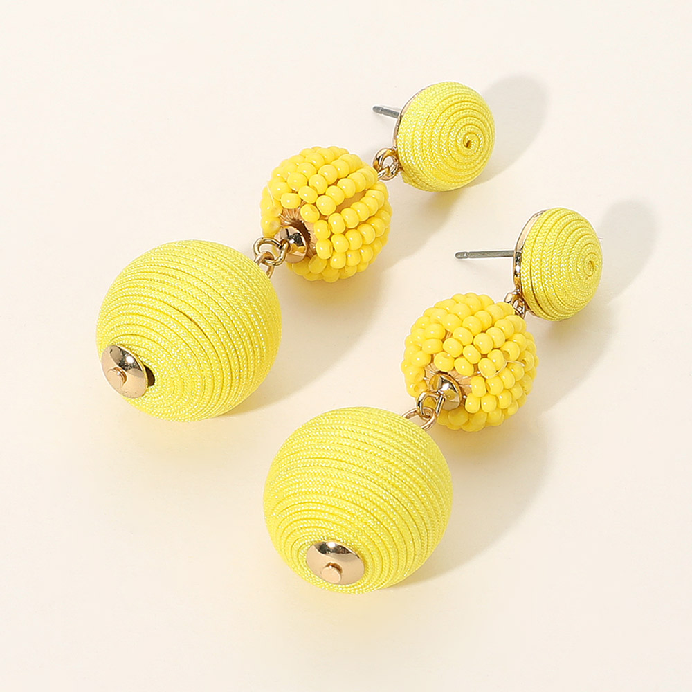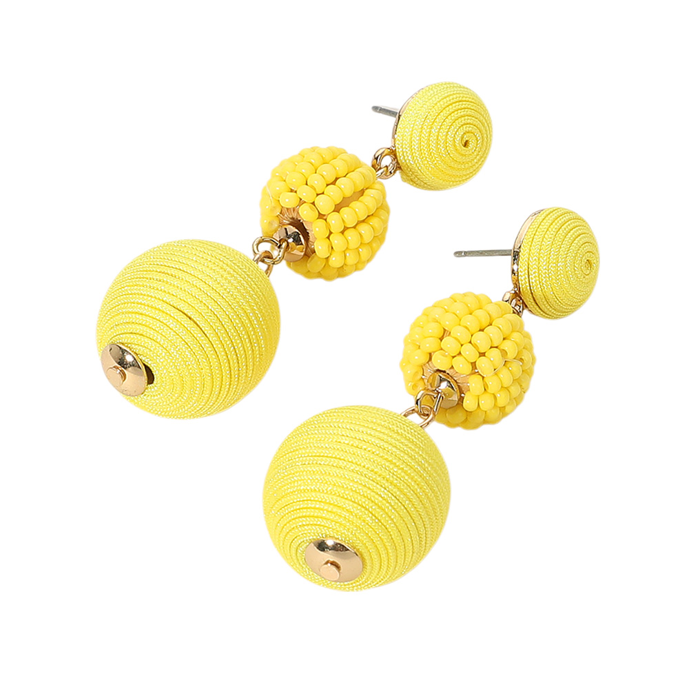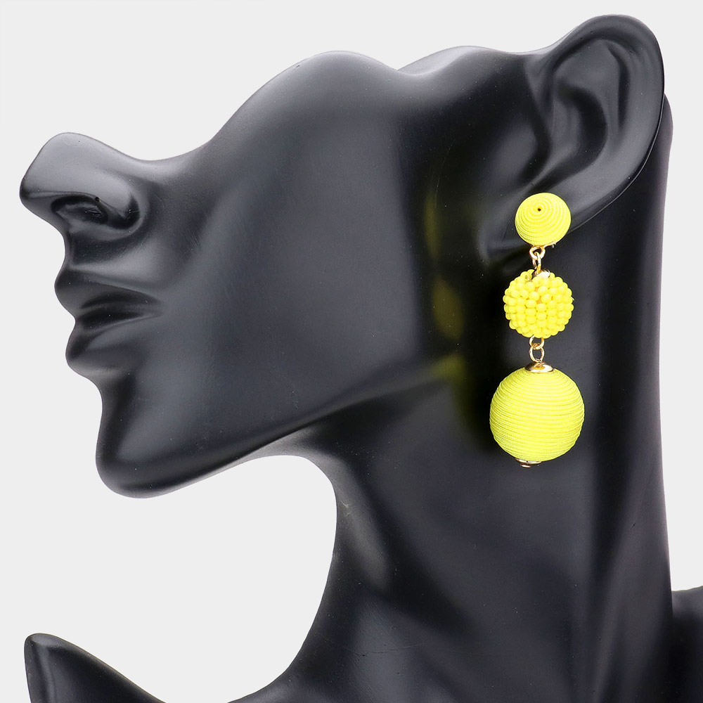 Details • Size : 0.7" X 2.25" • Post Back • Stylish triple ball drop earrings featuring a mix of wrapped thread and beaded textures. Lightweight and eye-catching, ideal for adding a playful and trendy vibe to casual or party outfits. • Lead and Nickel Compliant