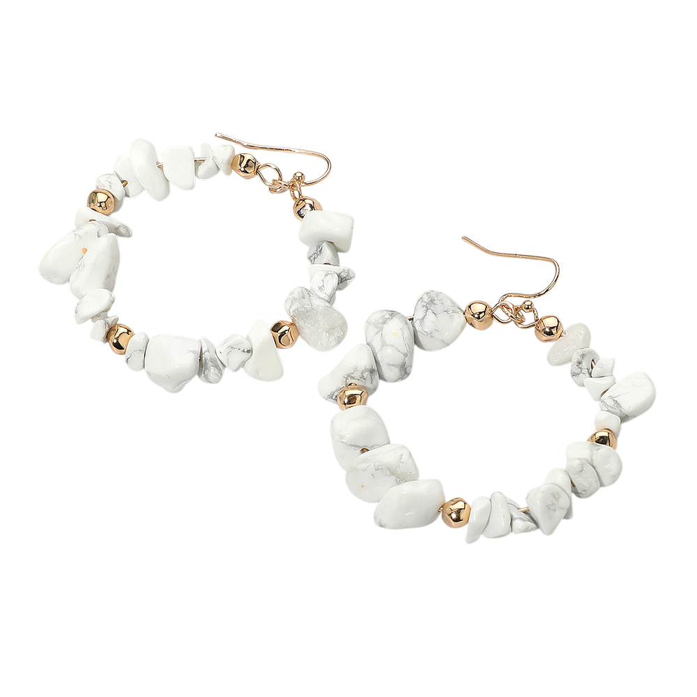 Details • Size : 2" X 2.25" • Fish Hook Back • Bold hoop earrings adorned with polished stone beads and metallic accents. Perfect for adding a touch of natural elegance to everyday wear or making a statement at special events and gatherings. • Lead and Nickel Compliant