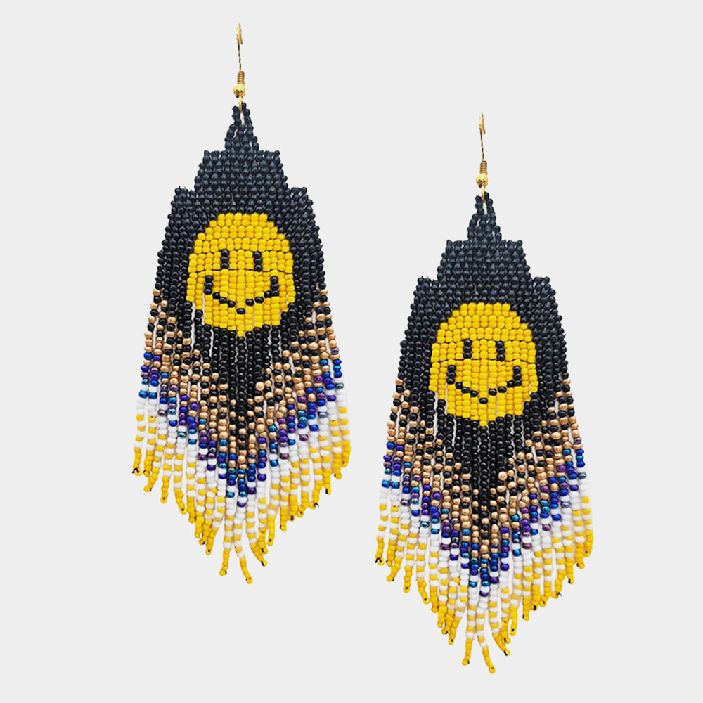 Smile Accented Seed Beaded Fringe Dangle Earrings