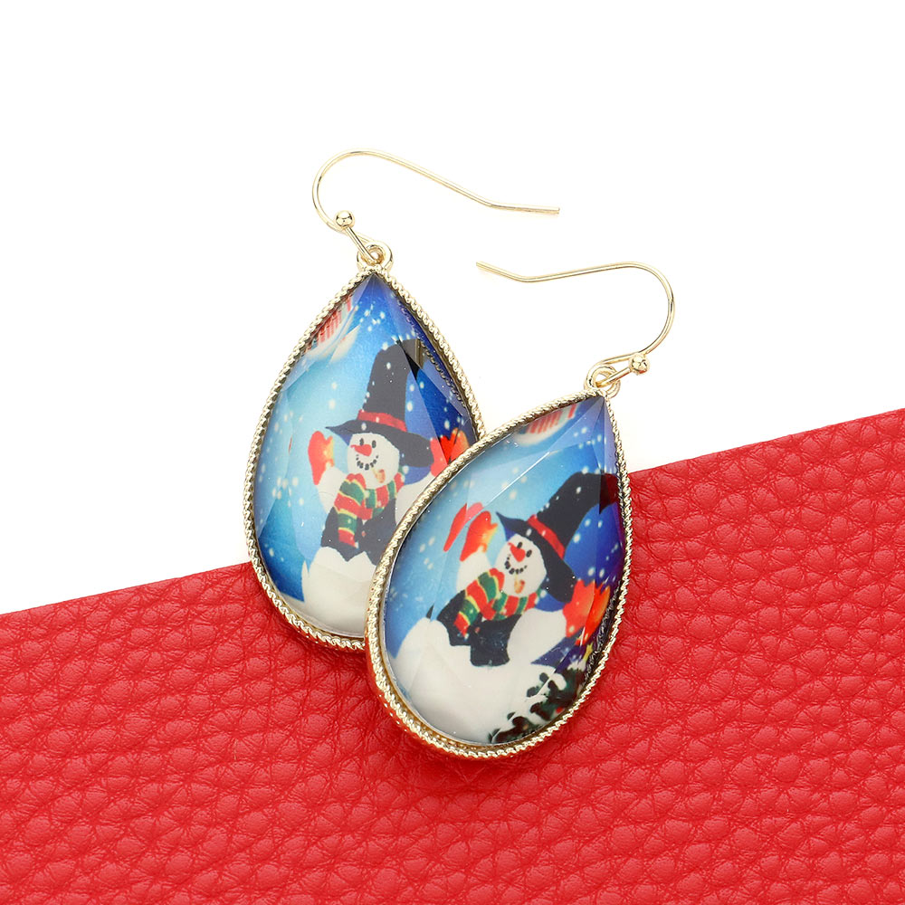 Details • Size : 0.8" X 2" • Fish Hook Back • Holiday-themed teardrop earrings featuring a joyful snowman scene in a glossy finish. A cheerful accessory perfect for winter outfits, seasonal parties, or gifting. Adds a fun and whimsical touch to any festive look throughout the holidays. • Lead and Nickel Compliant