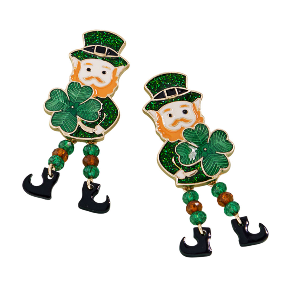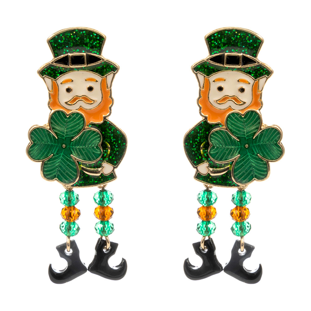 Details • Size : 0.75" X 2" • Titanium Post Back • Playful statement earrings featuring a leprechaun and clover motif with dangling accents for fun movement. Lightweight design ideal for holiday celebrations, themed parties, parades, or gifting, adding a whimsical finishing touch to festive outfits and seasonal accessories. • Hypoallergenic • Lead and Nickel Compliant