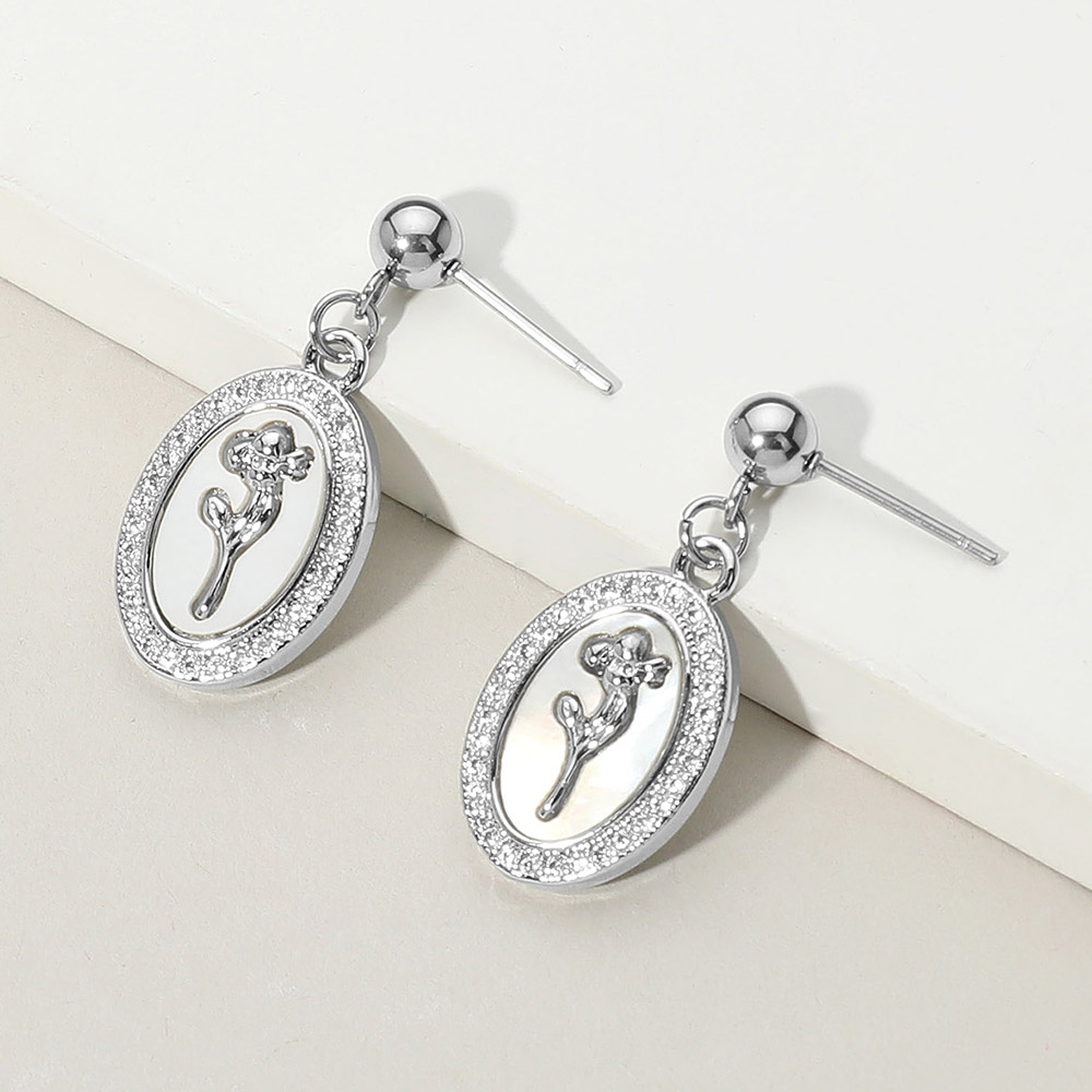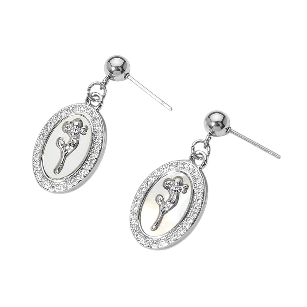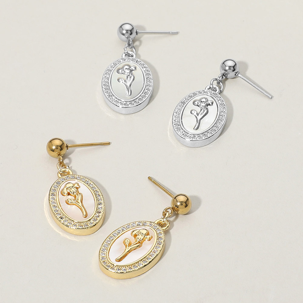 Stainless Steel Stone Paved Tulip Flower Embossed Mother of Pearl Oval Dangle Earrings