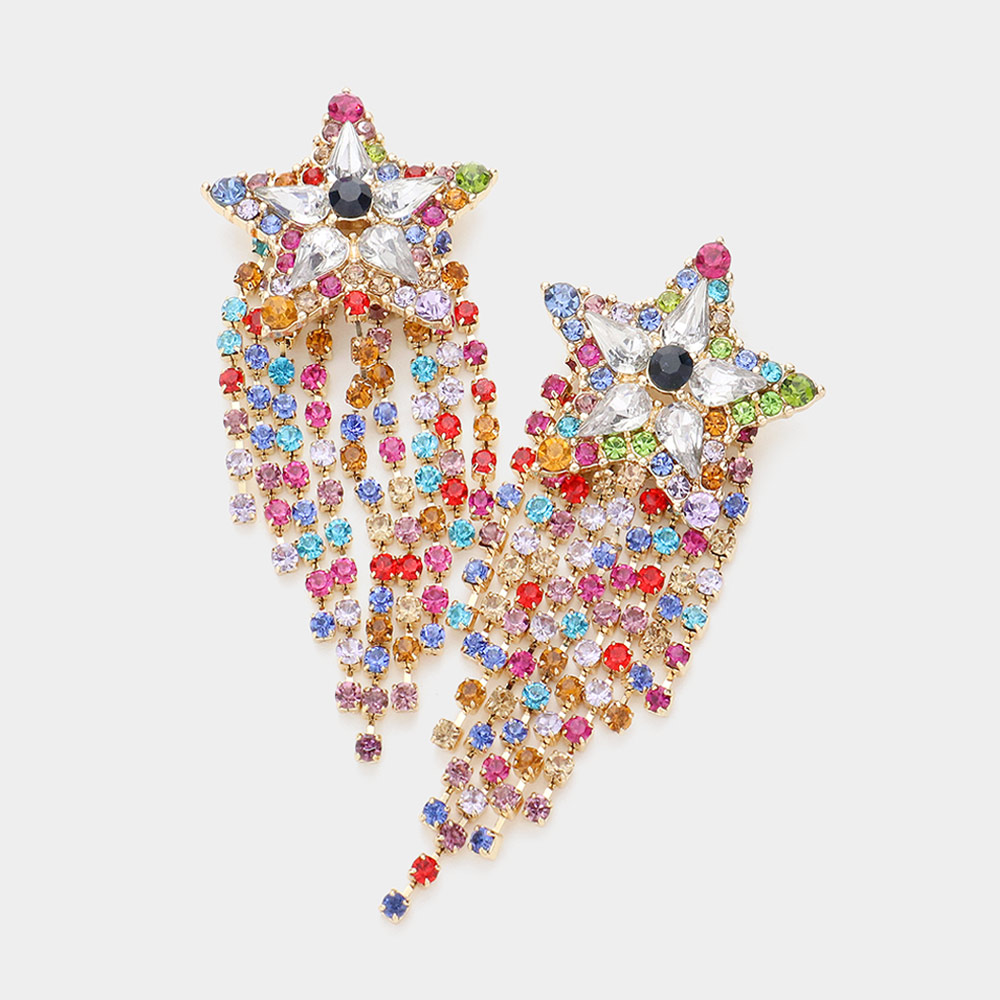 Open Teardrop Accented Rhinestone Fringe Dangle Evening Earrings