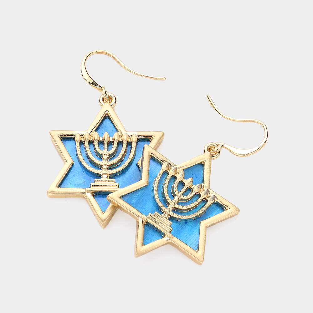 Details • Size : 1" X 1.75" • Fish Hook Back • Celebrate tradition with these Star of David dangle earrings featuring a detailed menorah design at the center. A meaningful accessory for cultural pride or spiritual expression, these earrings are perfect for holidays, special occasions, or thoughtful gifting. • Lead and Nickel Compliant