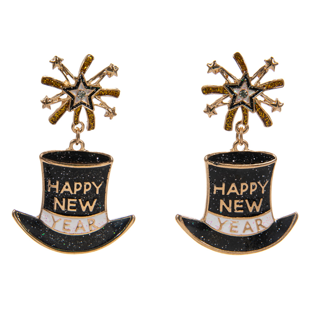 Details • Size : 1.25" X 1.8" • Titanium Post Back • Celebrate in style with these Happy New Year dangle earrings featuring sparkling starburst studs and festive top hat drops. Perfect for parties, countdown events, and holiday gatherings, these statement earrings add fun, cheer, and sparkle to your celebration look. • Hypoallergenic • Lead and Nickel Compliant