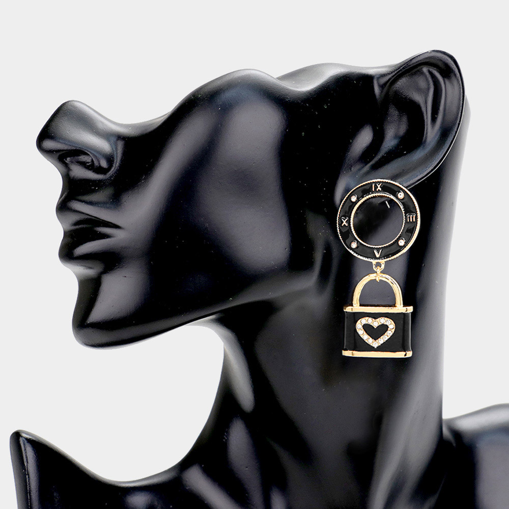 Stone Embellished Enamel Roman Numerals Heart Lock Link Dangle Earrings