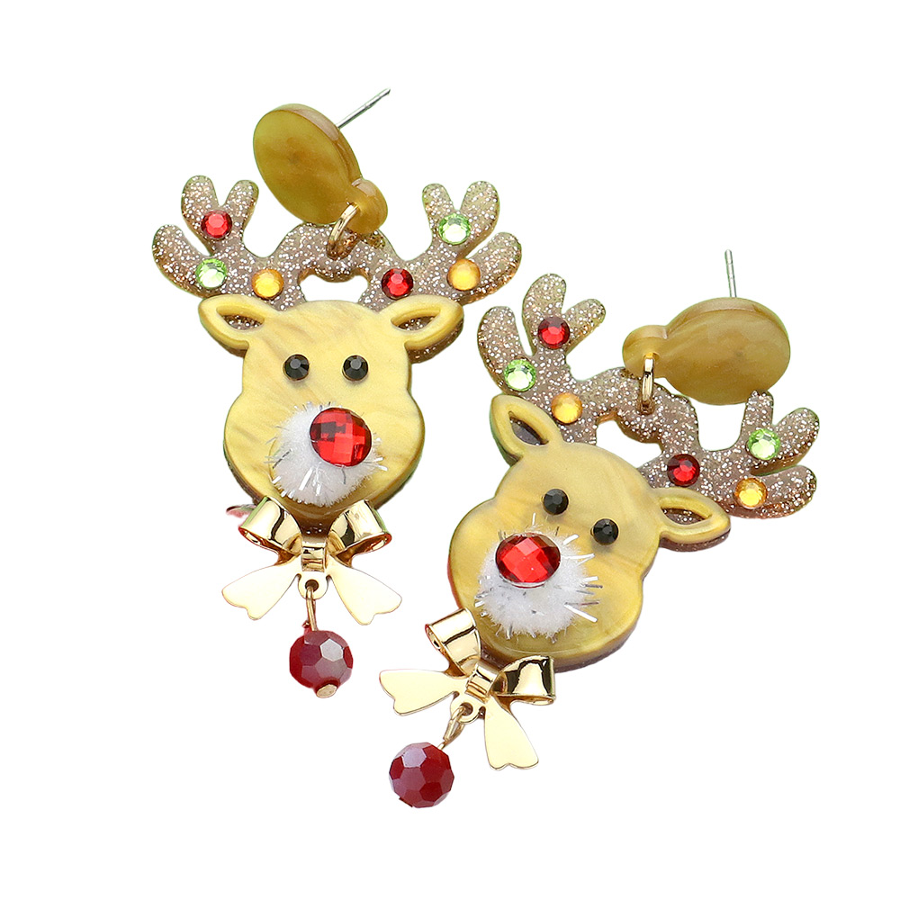 Stone Embellished Glittered Resin Rudolph Dangle Earrings