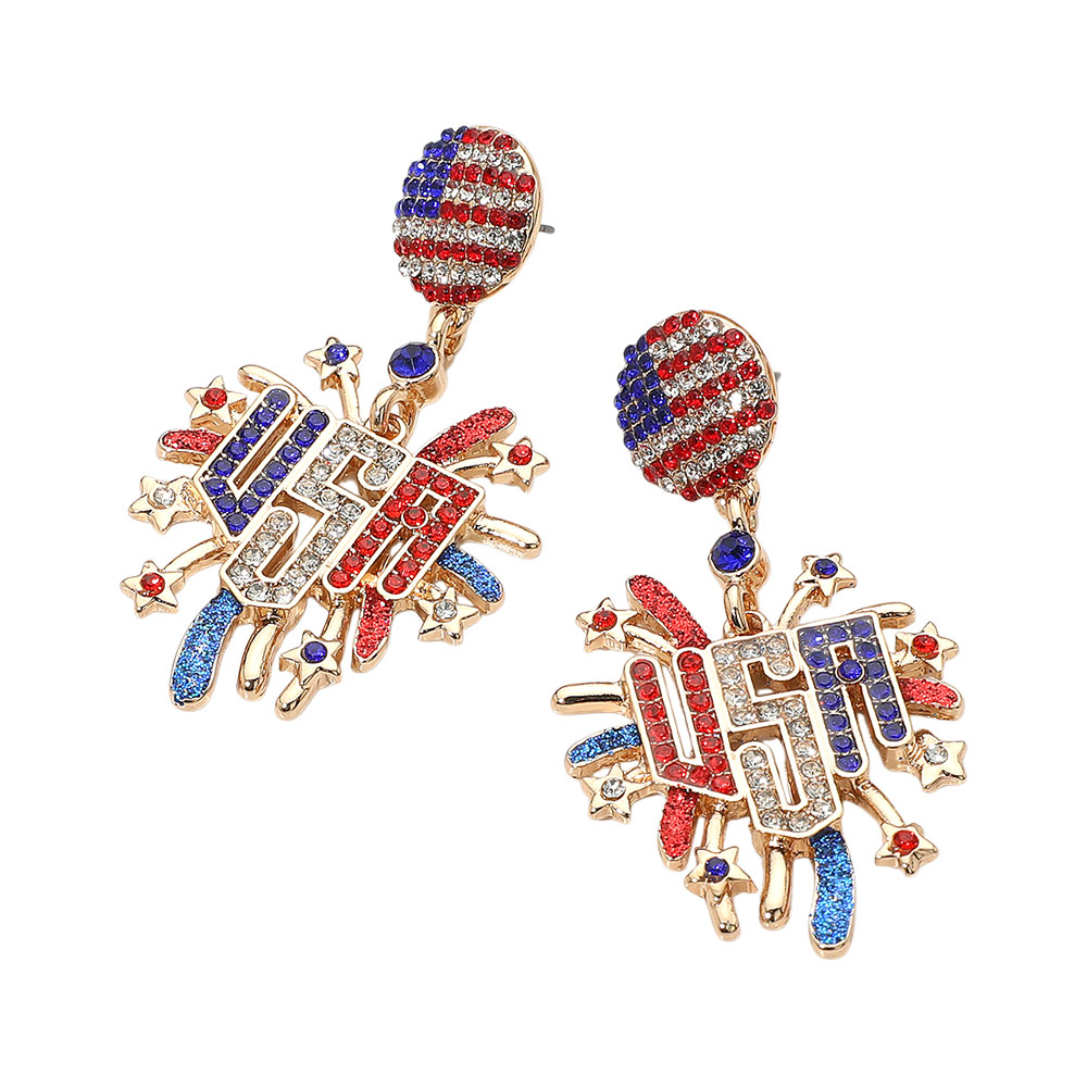 Details • Size : 1.25" X 2.3" • Post Back • Festive USA drop earrings featuring rhinestone accents and patriotic charm. Perfect accessory for national holidays, parties, or statement fashion looks. • Lead and Nickel Compliant