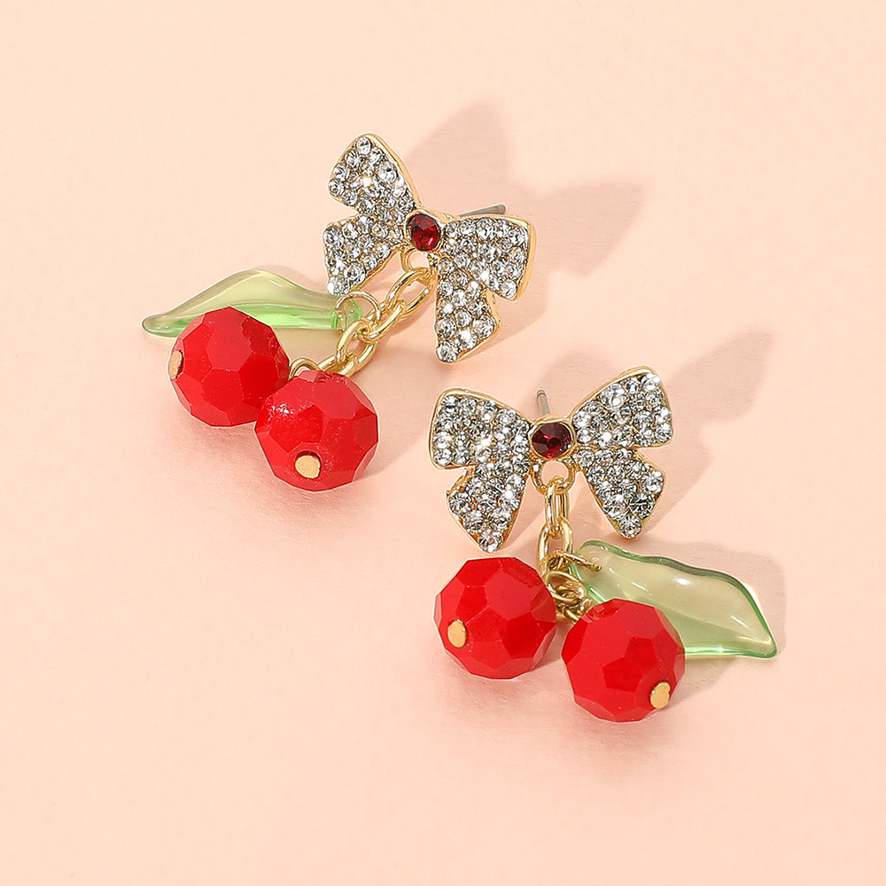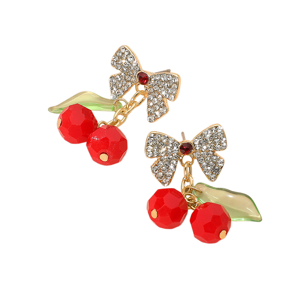Details • Size : 1" X 1.3" • Post Back • Cute cherry stud earrings accented with sparkling rhinestone bows and leafy details. A charming accessory that adds playful elegance to everyday or party looks. Lightweight and comfortable to wear. • Lead and Nickel Compliant