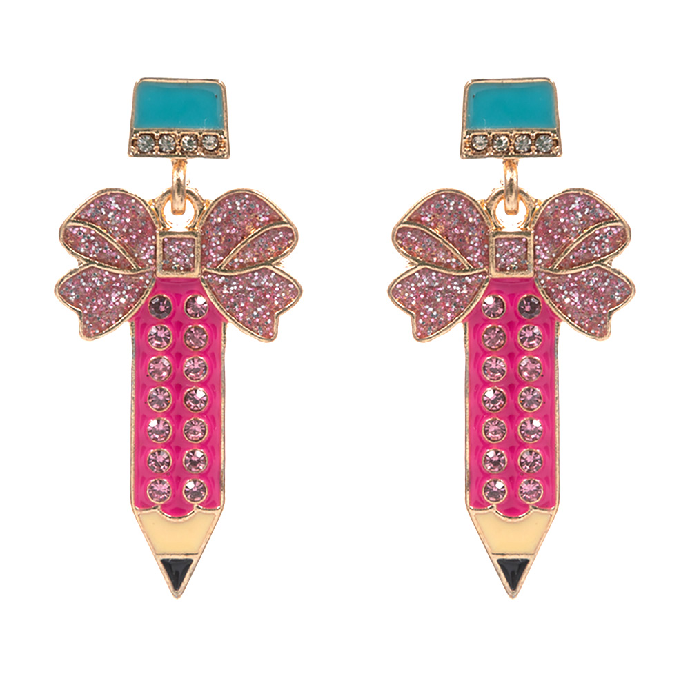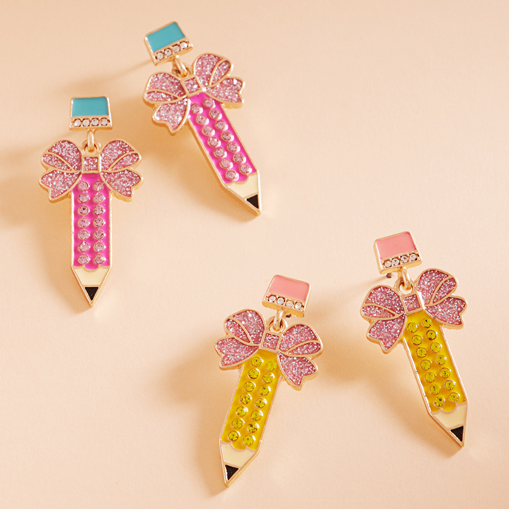 Details • Size : 0.7" X 1.5" • Titanium Post Back • Whimsical pencil bow drop earrings featuring a playful school-themed design with sparkling accents and charming bow details. Lightweight, fun, and perfect for teachers, students, or themed outfits. A cute accessory that adds personality and style to any look. • Lead and Nickel Compliant • Hypoallergenic