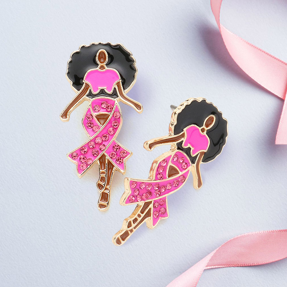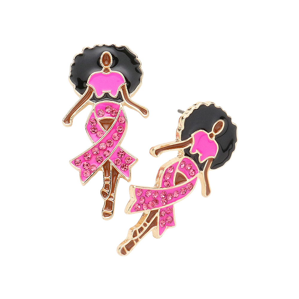 Stone Paved Pink Ribbon Enamel Afro Woman Earrings
