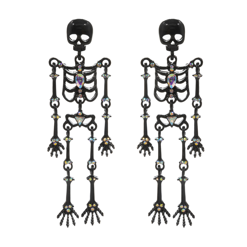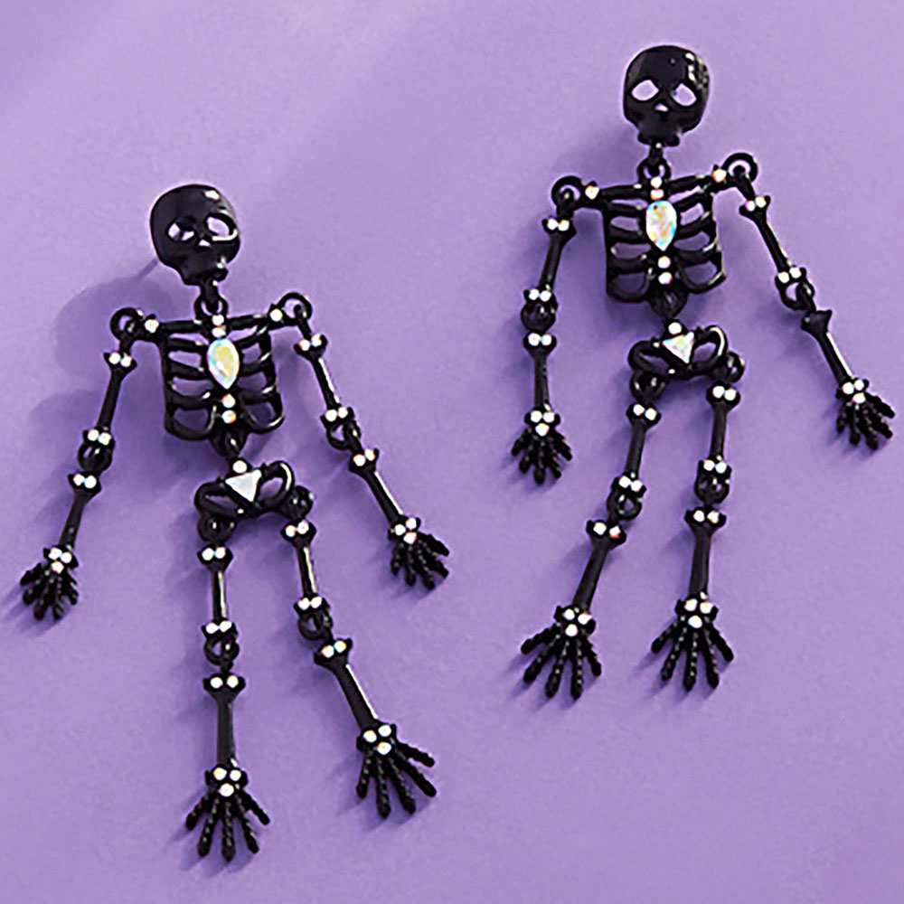 Details • Size : 1" X 3" • Titanium Post Back • Make a bold statement this Halloween with crystal-studded skeleton dangle earrings. These fun and spooky earrings add shimmer and personality to your costume or festive outfit for any themed celebration. • Lead and Nickel Compliant • Hypoallergenic