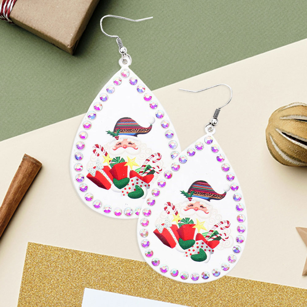 Stone Trim Santa Claus Xmas Gift Serape Print Metal Teardrop Dangle Earrings