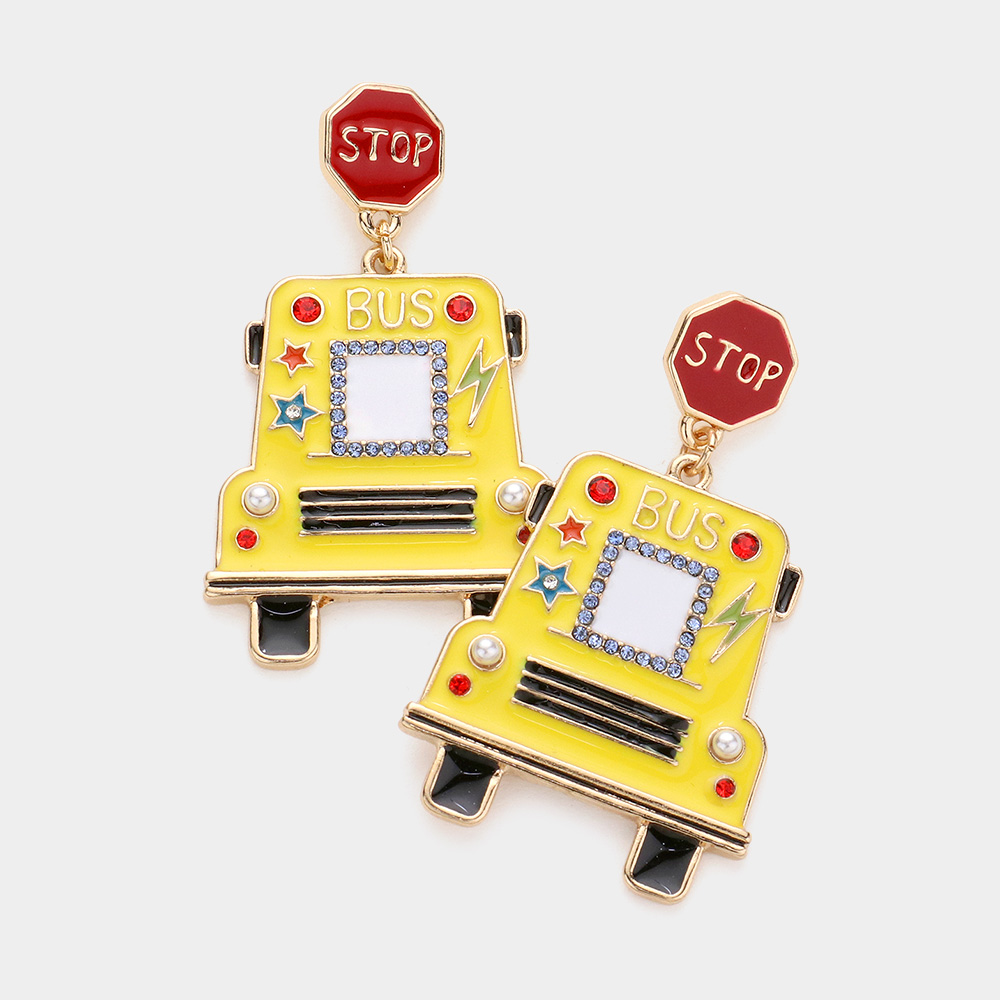 Stone Seed Bead Embellished School Bus Dangle Earrings