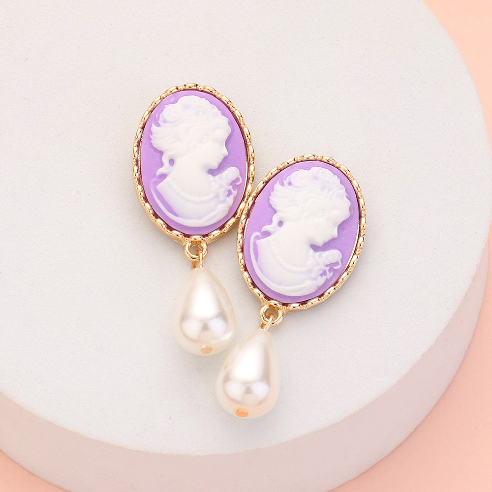 Pearl Rim Vintage Cameo Drop Dangle Earrings