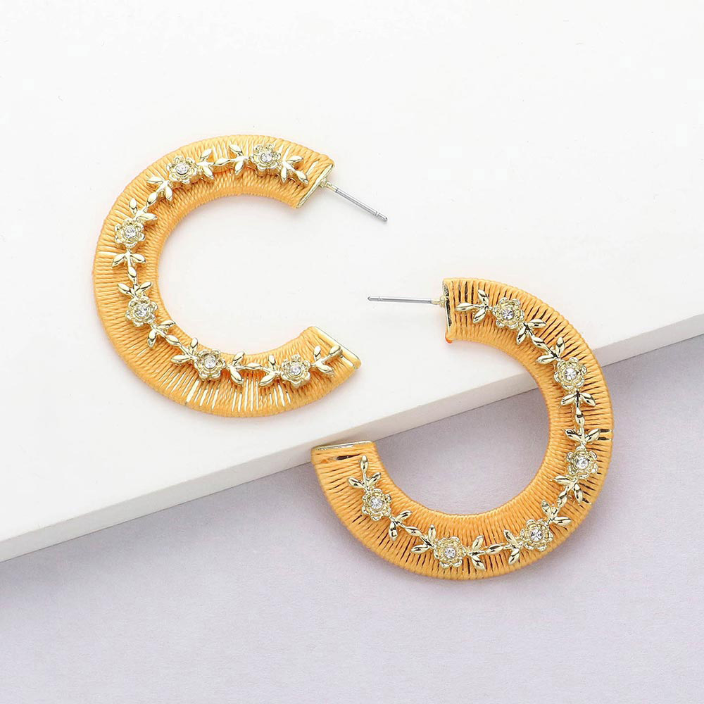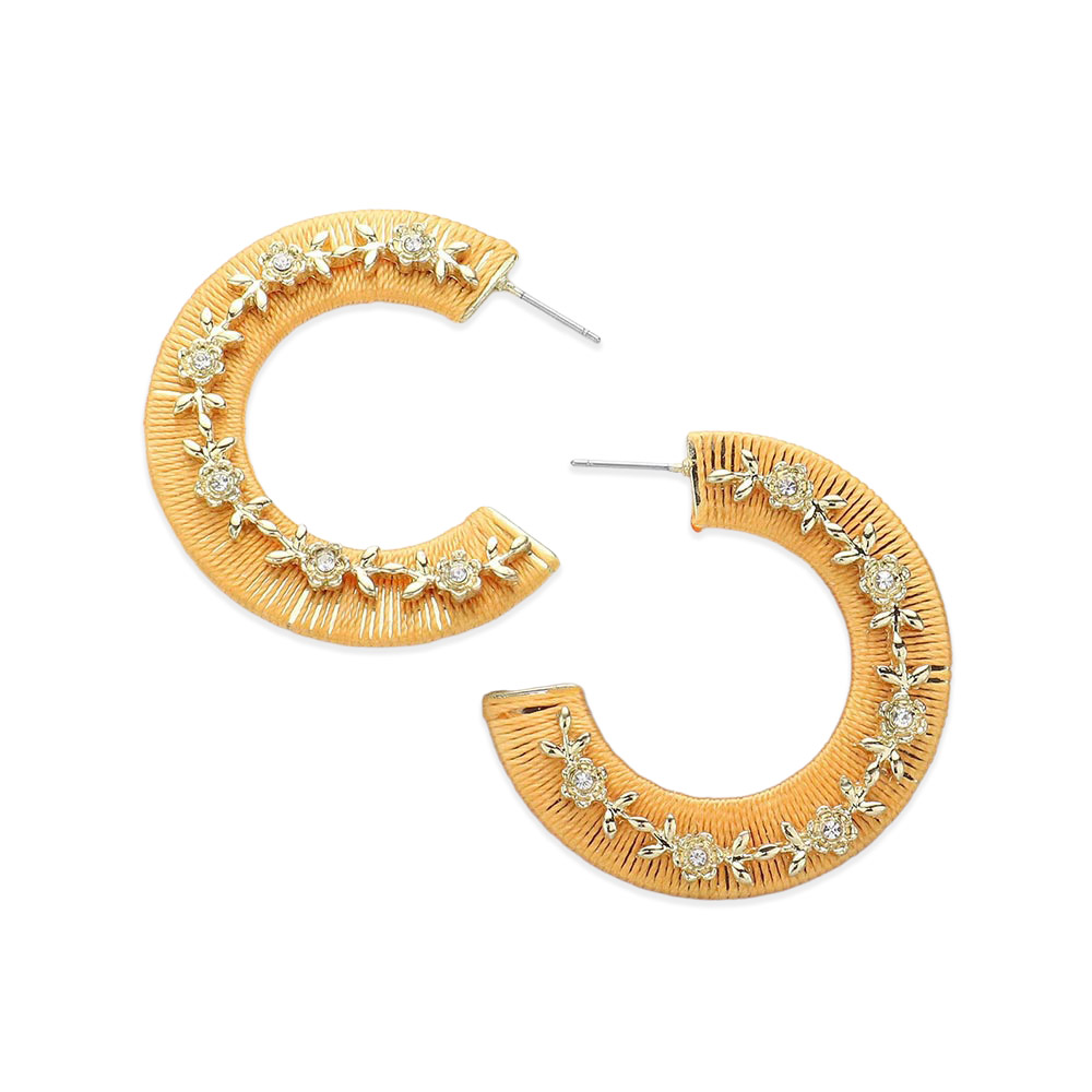 Thread Wrapped Rhinestone Flower Embellished Hoop Earrings