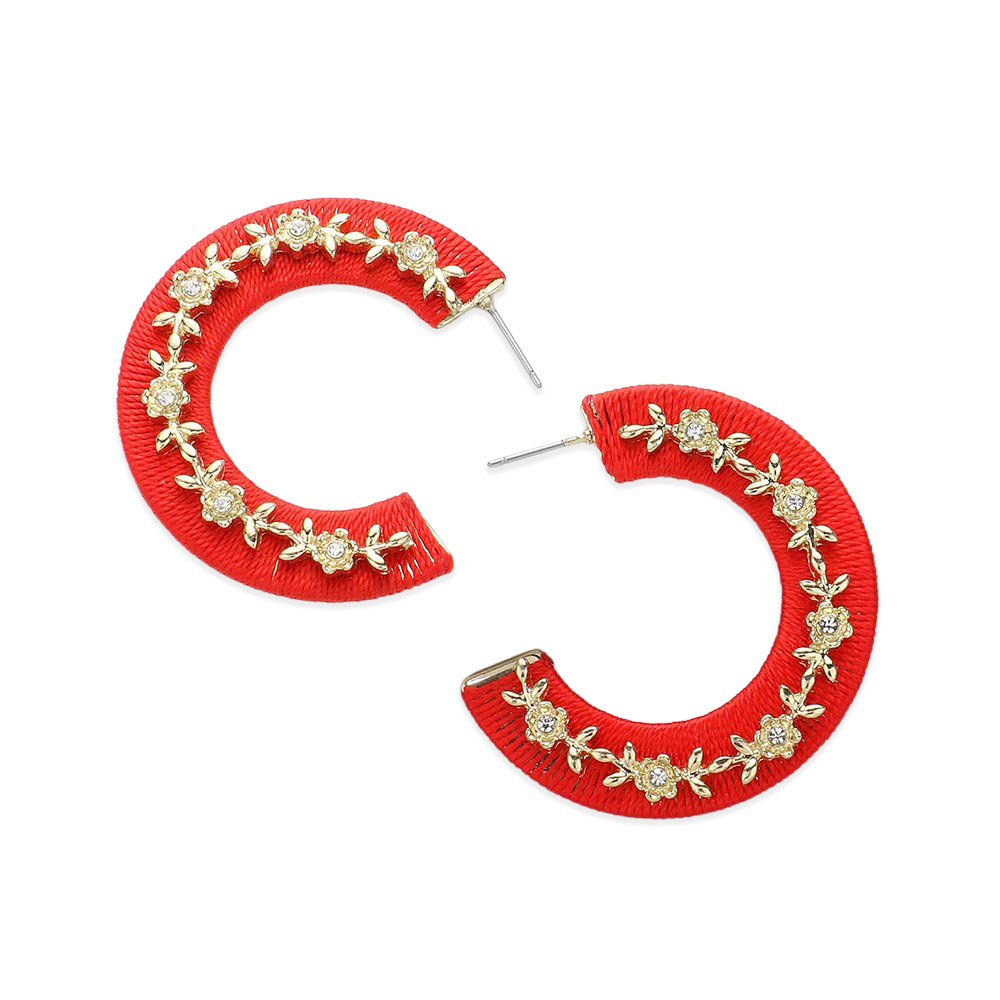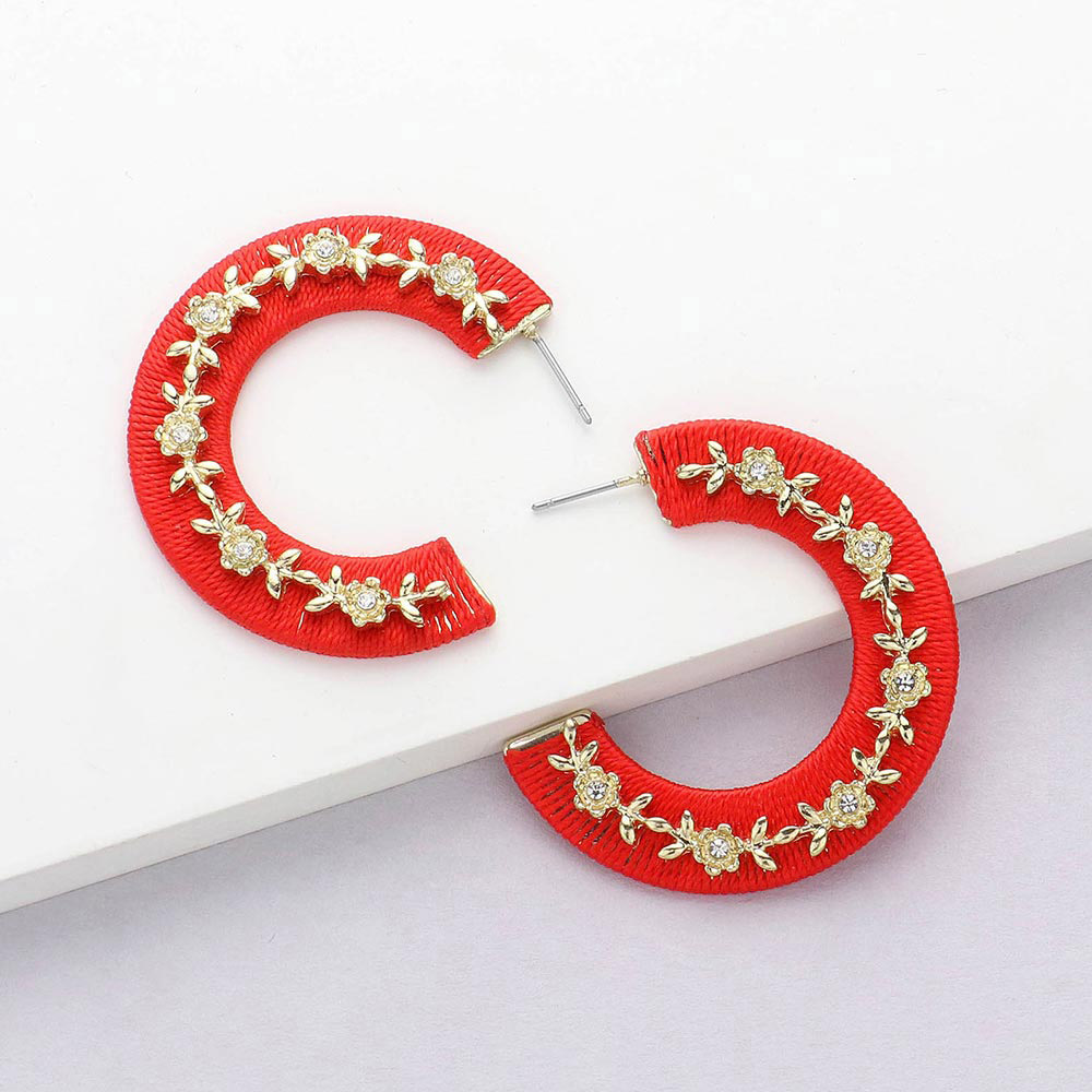 Thread Wrapped Rhinestone Flower Embellished Hoop Earrings