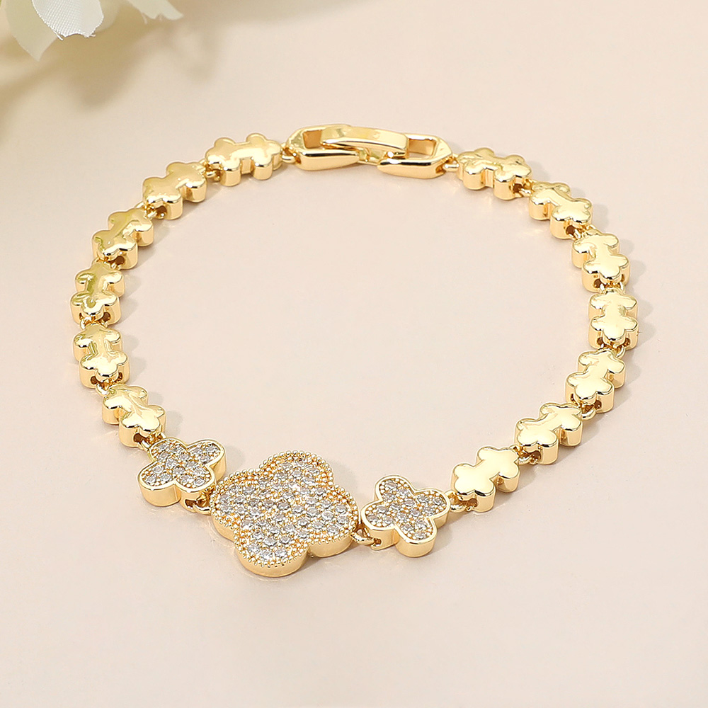 Details • Size : 0.7" H, 7.25" + 0.3" L • Fold Over Closure • Chic quatrefoil bracelet featuring a delicate chain of clover motifs accented with sparkling details. Perfect for adding elegance to everyday or formal outfits, this bracelet symbolizes luck and style. A refined accessory that enhances any jewelry collection with timeless charm and sophistication. • Brass • CZ Cubic Zirconia • Lead and Nickel Compliant
