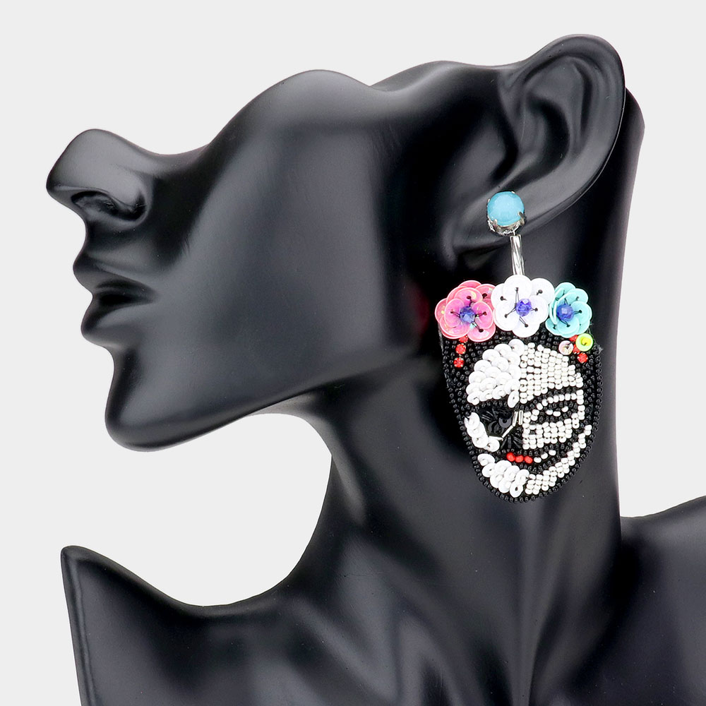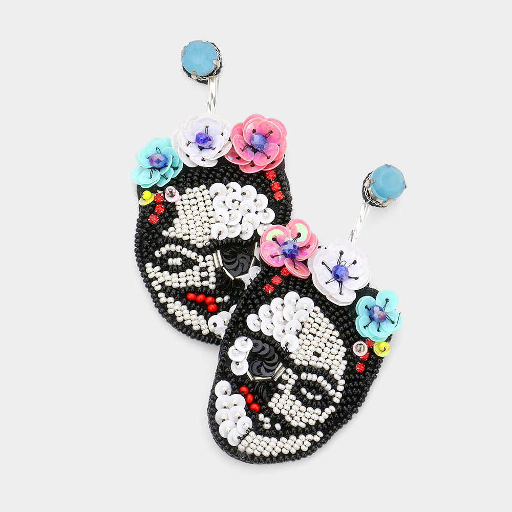 Triple Flower Sequin Seed Beaded Skull Dangle Earrings